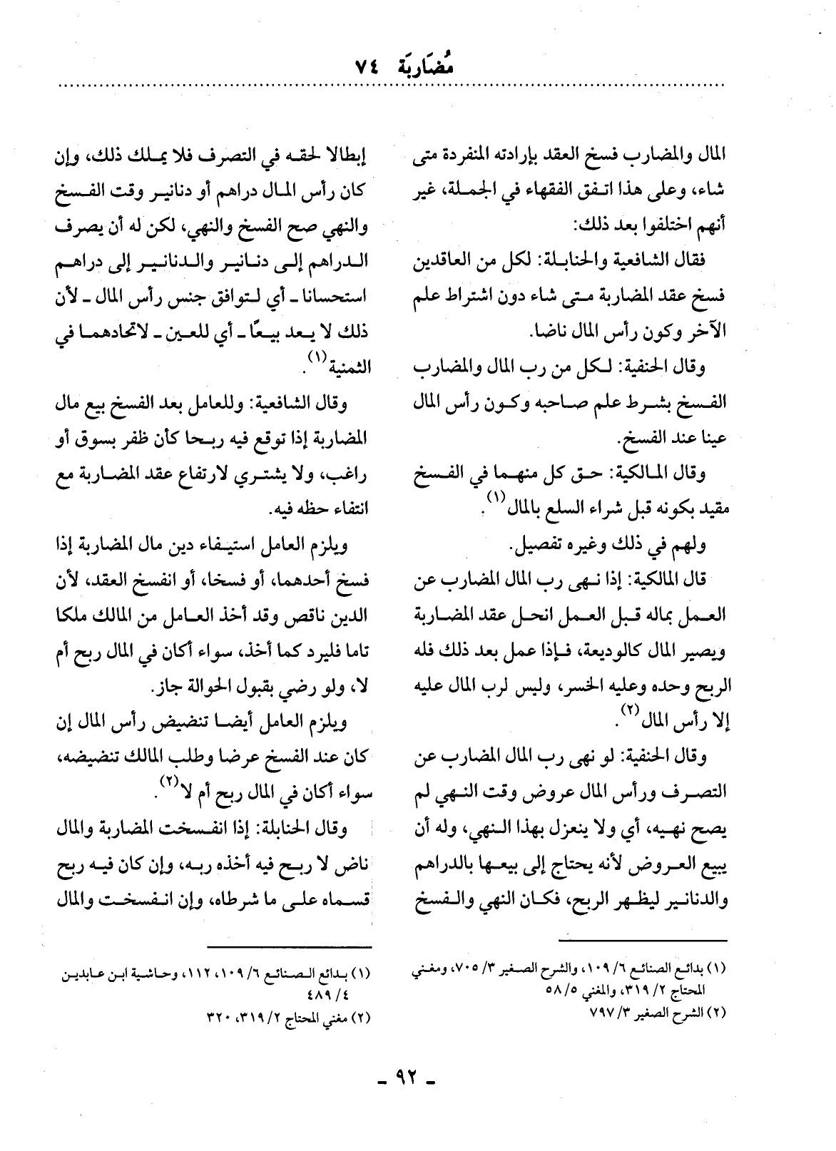 الْمَال وَالْمُضَارِبِ فَسْخُ الْعَقْدِ بِإِِِرَادَتِهِ الْمُنْفَرِدَةِ مَتَى شَاءَ، وَعَلَى هَذَا اتَّفَقَ الْفُقَهَاءُ فِي الْجُمْلَةِ، غَيْرَ أَنَّهُمُ اخْتَلَفُوا بَعْدَ ذَلِكَ: فَقَال الشَّافِعِيَّةُ وَالْحَنَابِلَةُ: لِكُل مِنَ الْعَاقِدَيْنِ فَسْخُ عَقْدِ الْمُضَارَبَةِ مَتَى شَاءَ دُونَ اشْتِرَاطِ عِلْمِ الآْخَرِ وَكَوْنُ رَأْسِ الْمَال نَاضًّا.