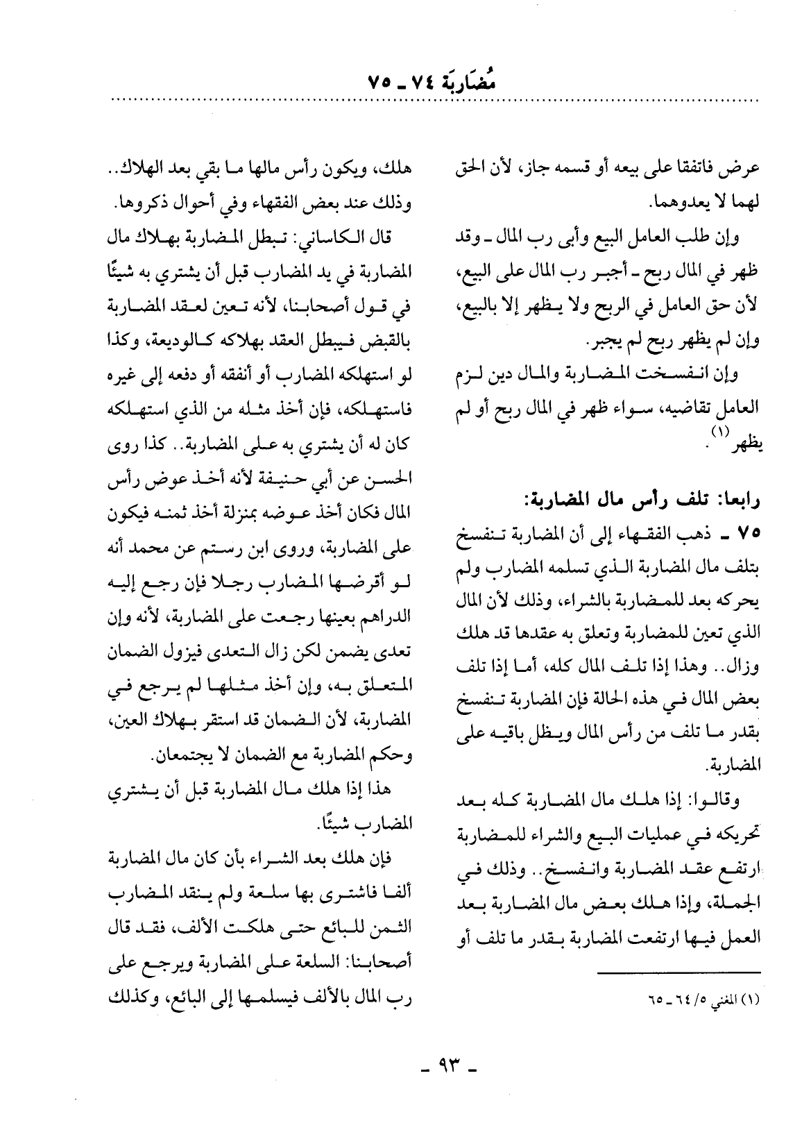 رَابِعًا: تَلَفُ رَأْسِ مَال الْمُضَارَبَةِ: 75 - ذَهَبَ الْفُقَهَاءُ إِِلَى أَنَّ الْمُضَارَبَةَ تَنْفَسِخُ بِتَلَفِ مَال الْمُضَارَبَةِ الَّذِي تَسَلَّمَهُ الْمُضَارِبُ وَلَمْ يُحَرِّكْهُ بَعْدُ لِلْمُضَارَبَةِ بِالشِّرَاءِ، وَذَلِكَ لأَِنَّ الْمَال الَّذِي تَعَيَّنَ لِلْمُضَارَبَةِ وَتَعَلَّقَ بِهِ عَقْدُهَا قَدْ هَلَكَ وَزَال. وَهَذَا إِِذَا تَلِفَ الْمَال كُلُّهُ، أَمَّا إِِذَا تَلِفَ بَعْضُ الْمَال فِي هَذِهِ الْحَالَةِ فَإِِِنَّ الْمُضَارَبَةَ تَنْفَسِخُ بِقَدْرِ مَا تَلِفَ مِنْ رَأْسِ الْمَال وَيَظَل بَاقِيهِ عَلَى الْمُضَارَبَةِ.