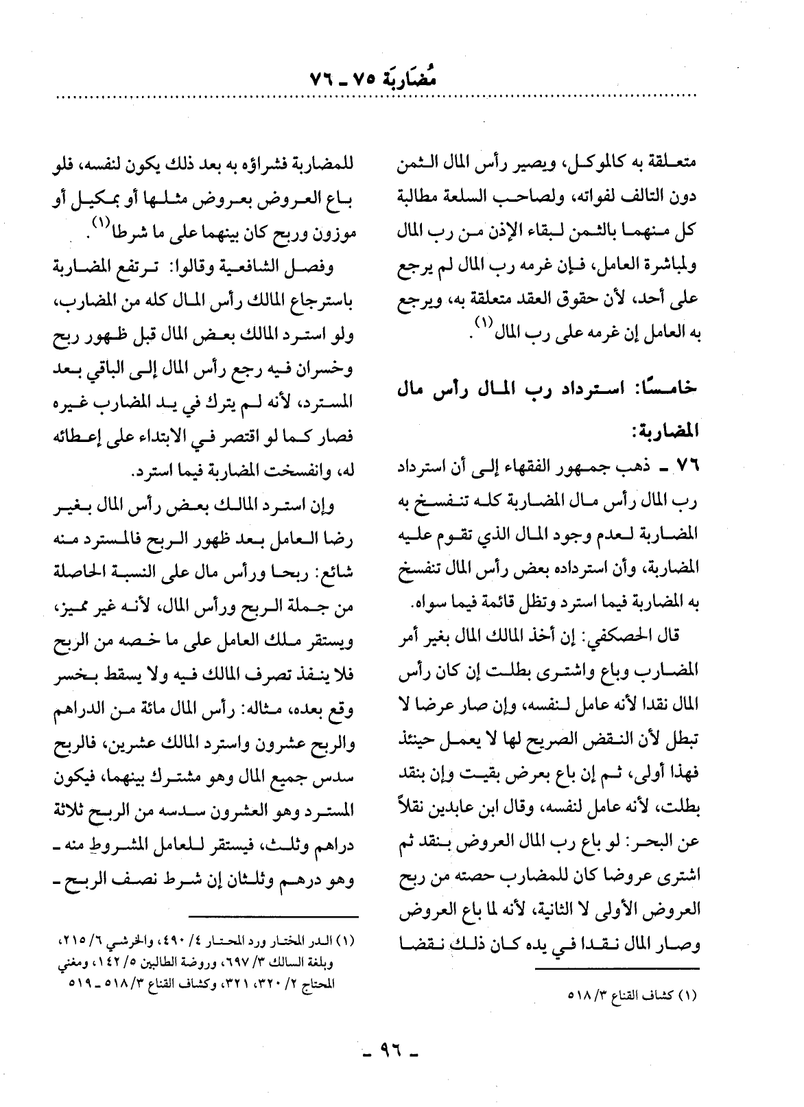 76 - ذَهَبَ جُمْهُورُ الْفُقَهَاءِ إِِلَى أَنَّ اسْتِرْدَادَ رَبِّ الْمَال رَأْسَ مَال الْمُضَارَبَةِ كُلَّهُ تَنْفَسِخُ بِهِ الْمُضَارَبَةُ لِعَدَمِ وُجُودِ الْمَال الَّذِي تَقُومُ عَلَيْهِ الْمُضَارَبَةُ، وَأَنَّ اسْتِرْدَادَهُ بَعْضَ رَأْسِ الْمَال تَنْفَسِخُ بِهِ الْمُضَارَبَةُ فِيمَا اسْتَرَدَّ وَتَظَل قَائِمَةً فِيمَا سِوَاهُ.