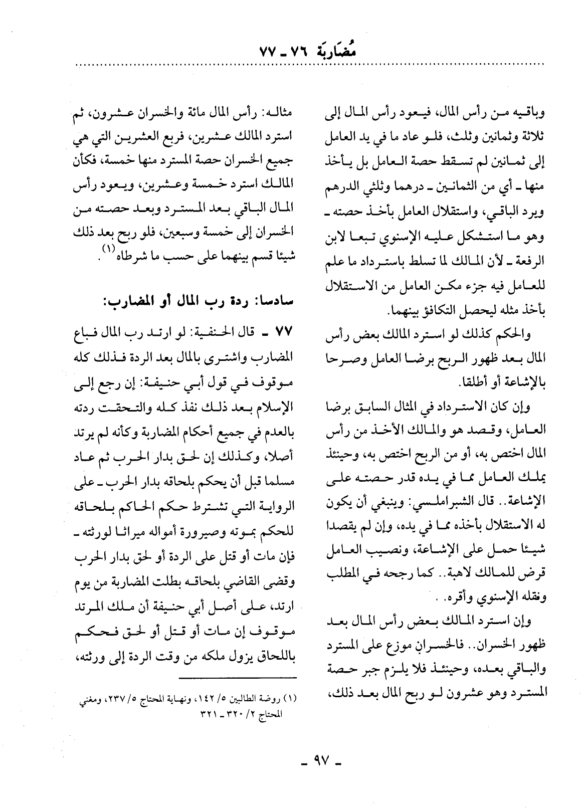 77 - قَال الْحَنَفِيَّةُ: لَوِ ارْتَدَّ رَبُّ الْمَال فَبَاعَ الْمُضَارِبُ وَاشْتَرَى بِالْمَال بَعْدَ الرِّدَّةِ فَذَلِكَ كُلُّهُ مَوْقُوفٌ فِي قَوْل أَبِي حَنِيفَةَ: إِِنْ رَجَعَ إِِلَى الإِِِْسْلاَمِ بَعْدَ ذَلِكَ نَفَذَ كُلُّهُ وَالْتَحَقَتْ رِدَّتُهُ بِالْعَدِمِ فِي جَمِيعِ أَحْكَامِ الْمُضَارَبَةِ وَكَأَنَّهُ لَمْ يَرْتَدَّ أَصْلاً، وَكَذَلِكَ إِِنْ لَحِقَ بِدَارِ الْحَرْبِ ثُمَّ عَادَ مُسْلِمًا قَبْل أَنْ يُحْكَمَ بِلَحَاقِهِ بِدَارِ الْحَرْبِ - عَلَى الرِّوَايَةِ الَّتِي تَشْتَرِطُ حُكْمَ الْحَاكِمِ بِلَحَاقِهِ لِلْحُكْمِ بِمَوْتِهِ وَصَيْرُورَةِ أَمْوَالِهِ مِيرَاثًا لِوَرَثَتِهِ - فَإِِِنْ مَاتَ أَوْ قُتِل عَلَى الرِّدَّةِ أَوْ لَحِقَ بِدَارِ الْحَرْبِ وَقَضَى الْقَاضِي بِلَحَاقِهِ بَطَلَتِ الْمُضَارَبَةُ مِنْ يَوْمِ ارْتَدَّ، عَلَى أَصْل أَبِي حَنِيفَةَ أَنَّ مِلْكَ الْمُرْتَدِّ مَوْقُوفٌ إِِنْ مَاتَ أَوْ قُتِل أَوْ لَحِقَ فَحُكِمَ بِاللَّحَاقِ يَزُول مِلْكُهُ مِنْ وَقْتِ الرِّدَّةِ إِِلَى وَرَثَتِهِ،