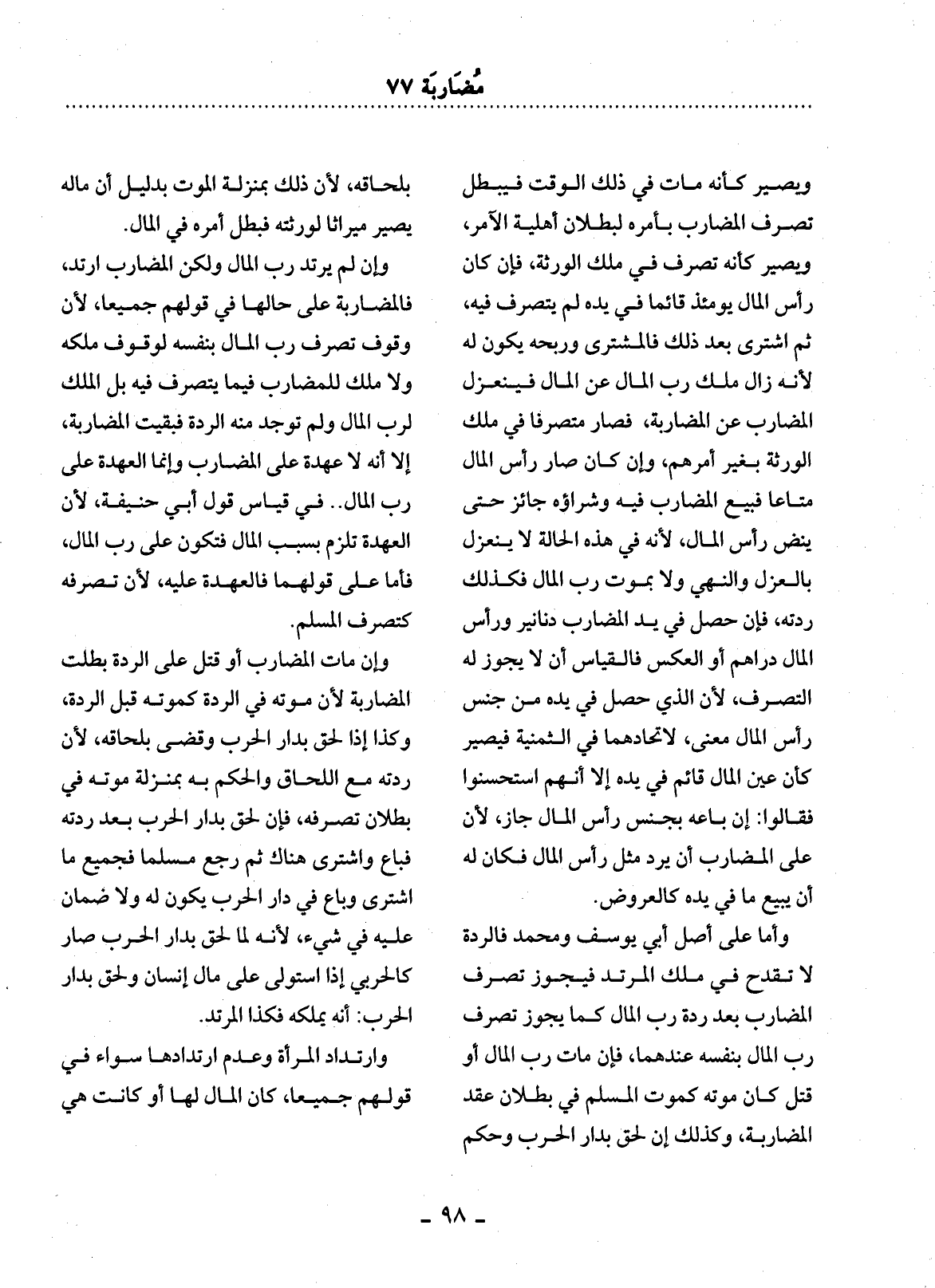 وَإِِِنْ مَاتَ الْمُضَارِبُ أَوْ قُتِل عَلَى الرِّدَّةِ بَطَلَتِ الْمُضَارَبَةُ لأَِنَّ مَوْتَهُ فِي الرِّدَّةِ كَمَوْتِهِ قَبْل الرِّدَّةِ، وَكَذَا إِِذَا لَحِقَ بِدَارِ الْحَرْبِ وَقُضِيَ بِلَحَاقِهِ، لأَِنَّ رِدَّتَهُ مَعَ اللَّحَاقِ وَالْحُكْمِ بِهِ بِمَنْزِلَةِ مَوْتِهِ فِي بُطْلاَنِ تَصَرُّفِهِ، فَإِِِنْ لَحِقَ بِدَارِ الْحَرْبِ بَعْدَ رِدَّتِهِ فَبَاعَ وَاشْتَرَى هُنَاكَ ثُمَّ رَجَعَ مُسْلِمًا فَجَمِيعُ مَا اشْتَرَى وَبَاعَ فِي دَارِ الْحَرْبِ يَكُونُ لَهُ وَلاَ ضَمَانَ عَلَيْهِ فِي شَيْءٍ، لأَِنَّهُ لَمَّا لَحِقَ بِدَارِ الْحَرْبِ صَارَ كَالْحَرْبِيِّ إِِذَا اسْتَوْلَى عَلَى مَال إِِنْسَانٍ وَلَحِقَ بِدَارِ الْحَرْبِ: أَنَّهُ يَمْلِكُهُ فَكَذَا الْمُرْتَدُّ.