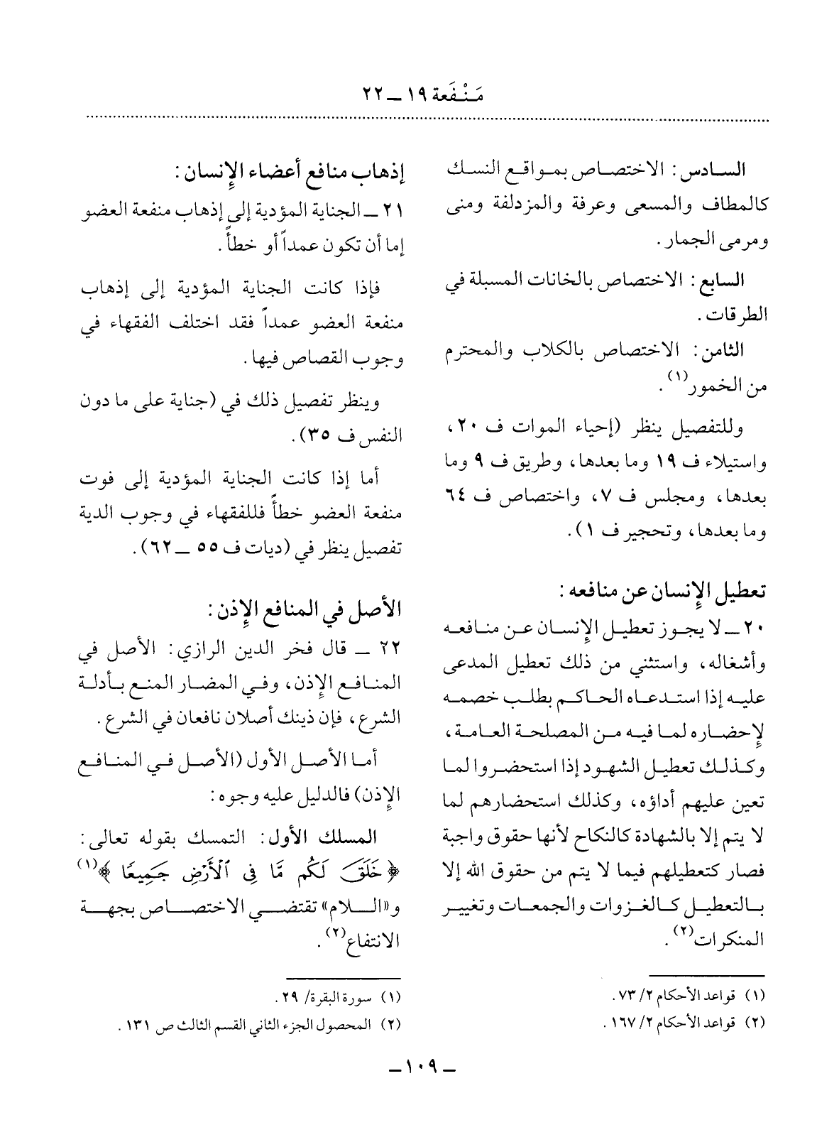 22 - قَال فَخْرُ الدِّينِ الرَّازِيُّ: الأَْصْل فِي الْمَنَافِعِ الإِْذْنُ وَفِي الْمَضَارِّ الْمَنْعُ بِأَدِلَّةِ الشَّرْعِ فَإِنَّ ذَيْنَكَ أَصْلاَنِ نَافِعَانِ فِي الشَّرْعِ.