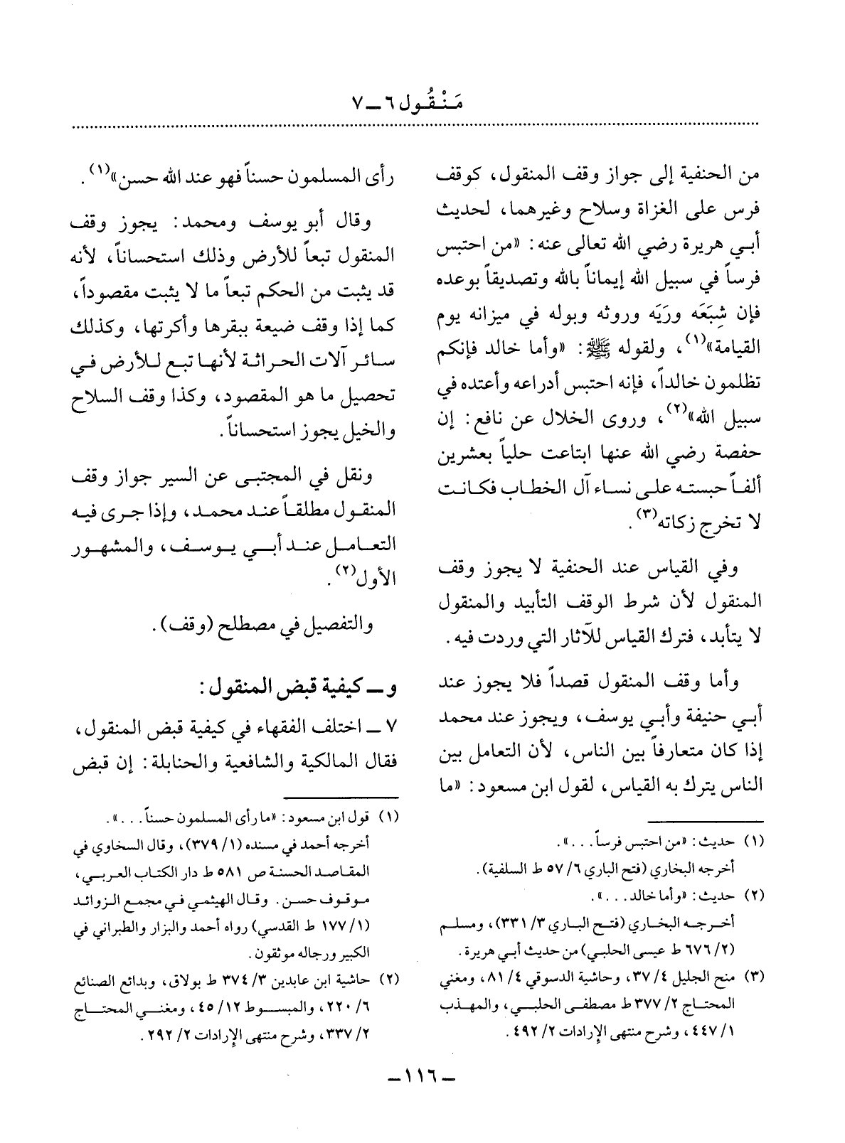مِنَ الْحَنَفِيَّةِ إِلَى جَوَازِ وَقْفِ الْمَنْقُول كَوَقْفِ فَرَسٍ عَلَى الْغُزَاةِ وَسِلاَحٍ وَغَيْرِهِمَا؛ لِحَدِيثِ أَبِي هُرَيْرَةَ رَضِيَ اللَّهُ تَعَالَى عَنْهُ: مَنِ احْتَبَسَ فَرَسًا فِي سَبِيل اللَّهِ إِيمَانًا بِاللَّهِ وَتَصْدِيقًا بِوَعْدِهِ فَإِنَّ شِبَعَهُ وَرِيَّهُ وَرَوْثَهُ وَبَوْلَهُ فِي مِيزَانِهِ يَوْمَ الْقِيَامَةِ (1) وَلِقَوْلِهِ صَلَّى اللَّهُ عَلَيْهِ وَسَلَّمَ: وَأَمَّا خَالِدٌ فَإِنَّكُمْ تَظْلِمُونَ خَالِدًا، فَإِنَّهُ احْتَبَسَ أَدْرَاعَهُ وَأَعْتُدَهُ فِي سَبِيل اللَّهِ (2) وَرَوَى الْخَلاَّل عَنْ نَافِعٍ: أَنَّ حَفْصَةَ رَضِيَ اللَّهُ عَنْهَا ابْتَاعَتْ حُلِيًّا بِعِشْرِينَ أَلْفًا حَبَسَتْهُ عَلَى نِسَاءِ آل الْخَطَّابِ فَكَانَتْ لاَ تُخْرِجُ زَكَاتَهُ (3) .