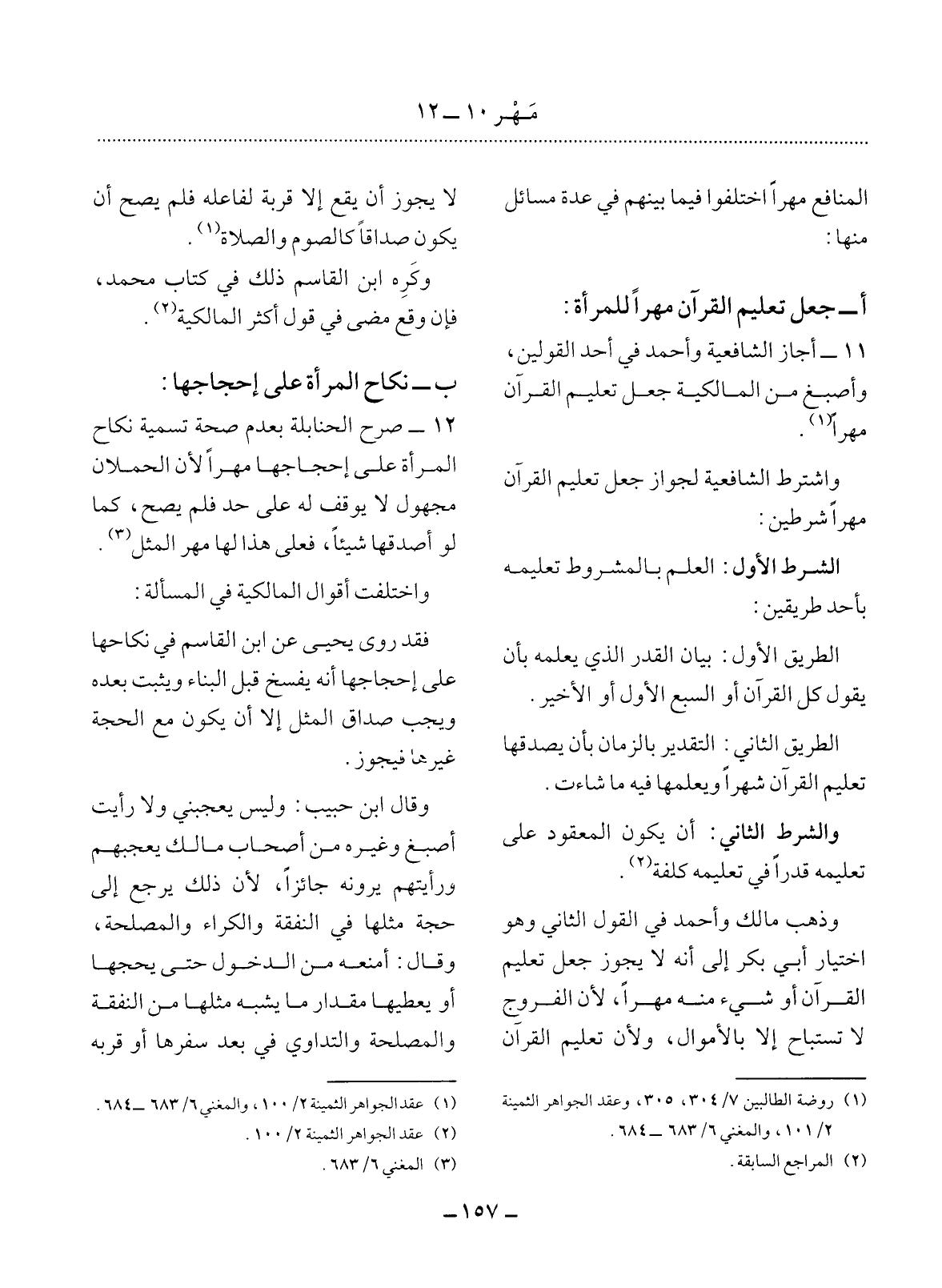 11 - أَجَازَ الشَّافِعِيَّةُ وَأَحْمَدُ فِي أَحَدِ الْقَوْلَيْنِ؛ وَأَصْبَغُ مِنَ الْمَالِكِيَّةِ جَعْل تَعْلِيمِ الْقُرْآنِ مَهْرًا (1) .