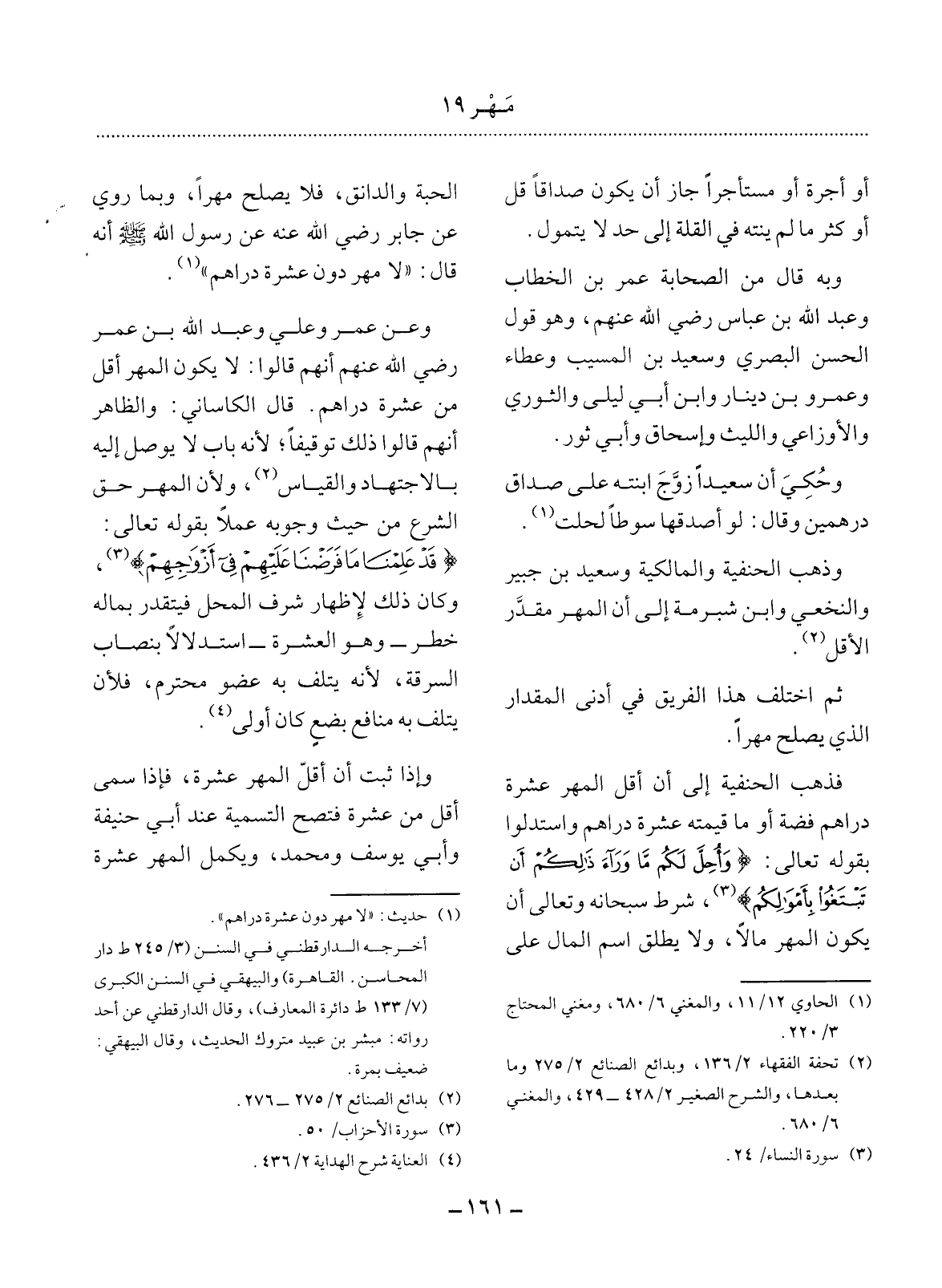 فَذَهَبَ الْحَنَفِيَّةُ إِلَى أَنَّ أَقَل الْمَهْرِ عَشَرَةُ دَرَاهِمَ فِضَّةً أَوْ مَا قِيمَتُهُ عَشَرَةُ دَرَاهِمَ وَاسْتَدَلُّوا بِقَوْلِهِ تَعَالَى: {وَأُحِل لَكُمْ مَا وَرَاءَ ذَلِكُمْ أَنْ تَبْتَغُوا بِأَمْوَالِكُمْ} ؛ شَرَطَ سُبْحَانَهُ وَتَعَالَى أَنْ يَكُونَ الْمَهْرُ مَالاً؛ وَلاَ يُطْلَقُ اسْمُ الْمَال عَلَى