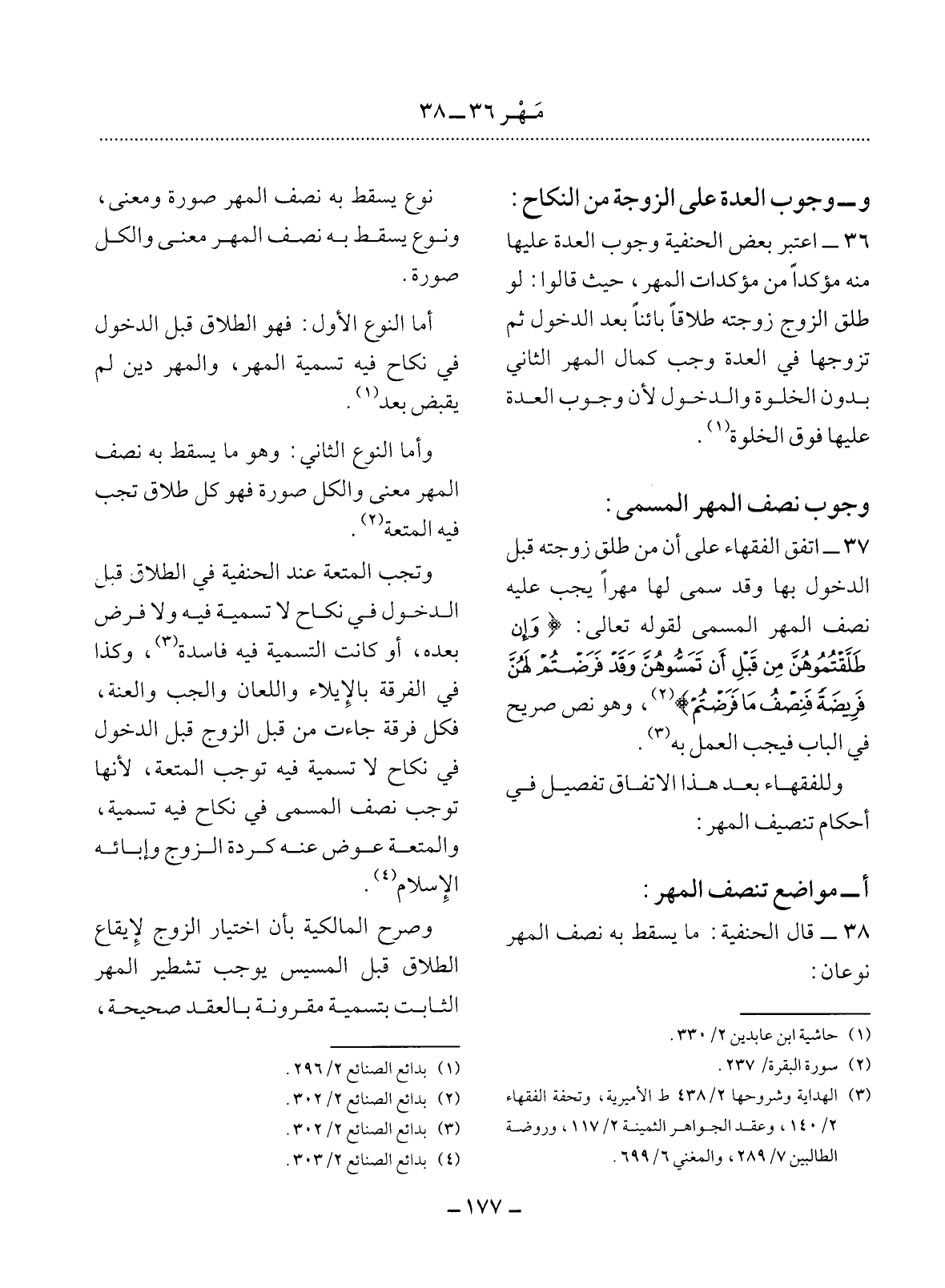 37 - اتَّفَقَ الْفُقَهَاءُ عَلَى أَنَّ مَنْ طَلَّقَ زَوْجَتَهُ قَبْل الدُّخُول بِهَا وَقَدْ سَمَّى لَهَا مَهْرًا يَجِبُ عَلَيْهِ نِصْفُ الْمَهْرِ الْمُسَمَّى لِقَوْلِهِ تَعَالَى: {وَإِنْ طَلَّقْتُمُوهُنَّ مِنْ قَبْل أَنْ تَمَسُّوهُنَّ وَقَدْ فَرَضْتُمْ لَهُنَّ فَرِيضَةً فَنِصْفُ مَا فَرَضْتُمْ} ؛ وَهُوَ نَصٌّ صَرِيحٌ فِي الْبَابِ فَيَجِبُ الْعَمَل بِهِ (2) .