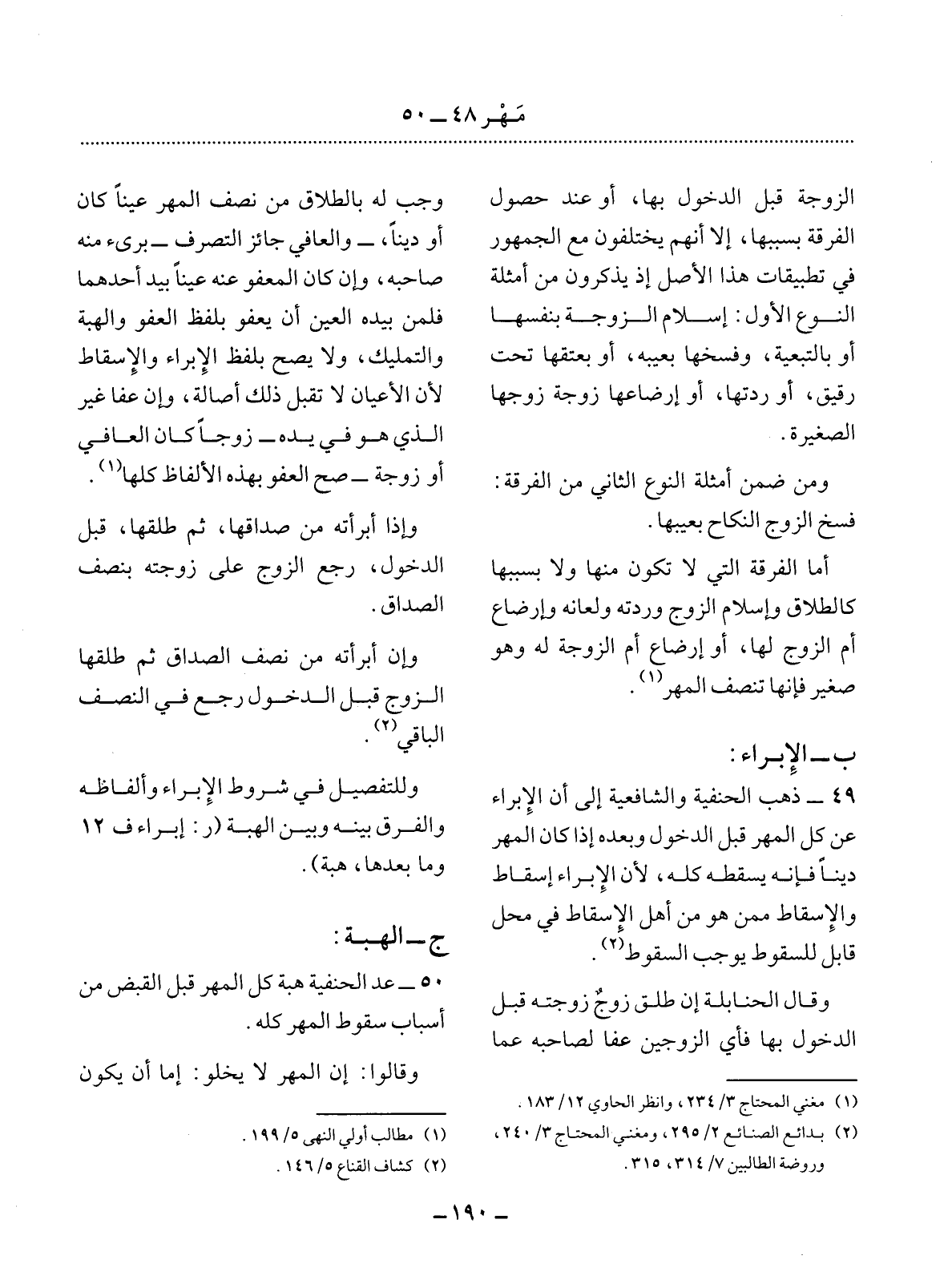 50 - عَدَّ الْحَنَفِيَّةُ هِبَةَ كُل الْمَهْرِ قَبْل الْقَبْضِ مِنْ أَسْبَابِ سُقُوطِ الْمَهْرِ كُلِّهِ.