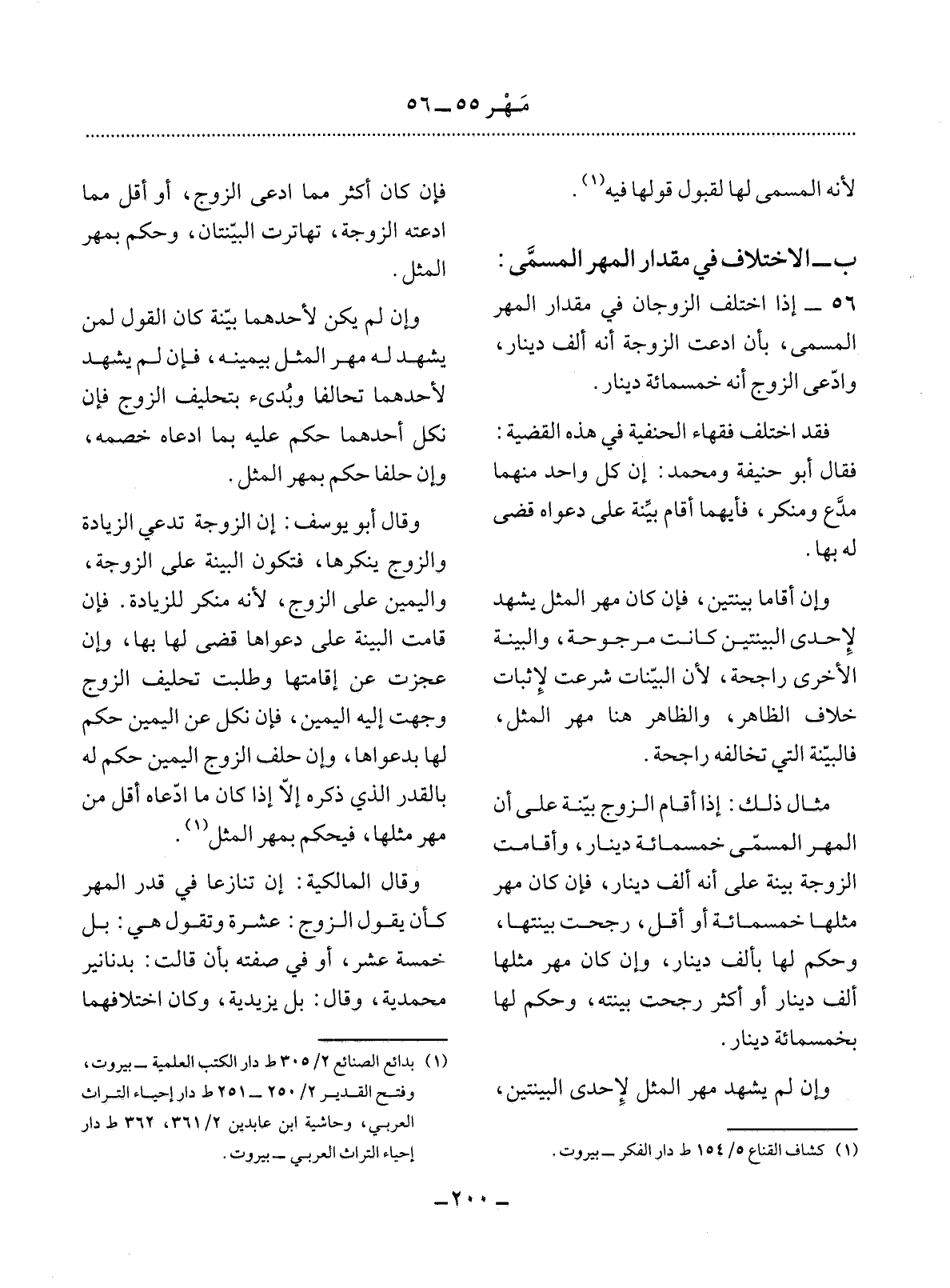 56 - إِذَا اخْتَلَفَ الزَّوْجَانِ فِي مِقْدَارِ الْمَهْرِ الْمُسَمَّى بِأَنِ ادَّعَتِ الزَّوْجَةُ أَنَّهُ أَلْفُ دِينَارٍ؛ وَادَّعَى الزَّوْجُ أَنَّهُ خَمْسُمِائَةِ دِينَارٍ؛ فَقَدِ اخْتَلَفَ فُقَهَاءُ الْحَنَفِيَّةِ فِي هَذِهِ الْقَضِيَّةِ: فَقَال أَبُو حَنِيفَةَ وَمُحَمَّدٌ: إِنَّ كُل وَاحِدٍ مِنْهُمَا مُدَّعٍ وَمُنْكِرٌ؛ فَأَيُّهُمَا أَقَامَ بَيِّنَةً عَلَى دَعْوَاهُ قُضِيَ لَهُ بِهَا.