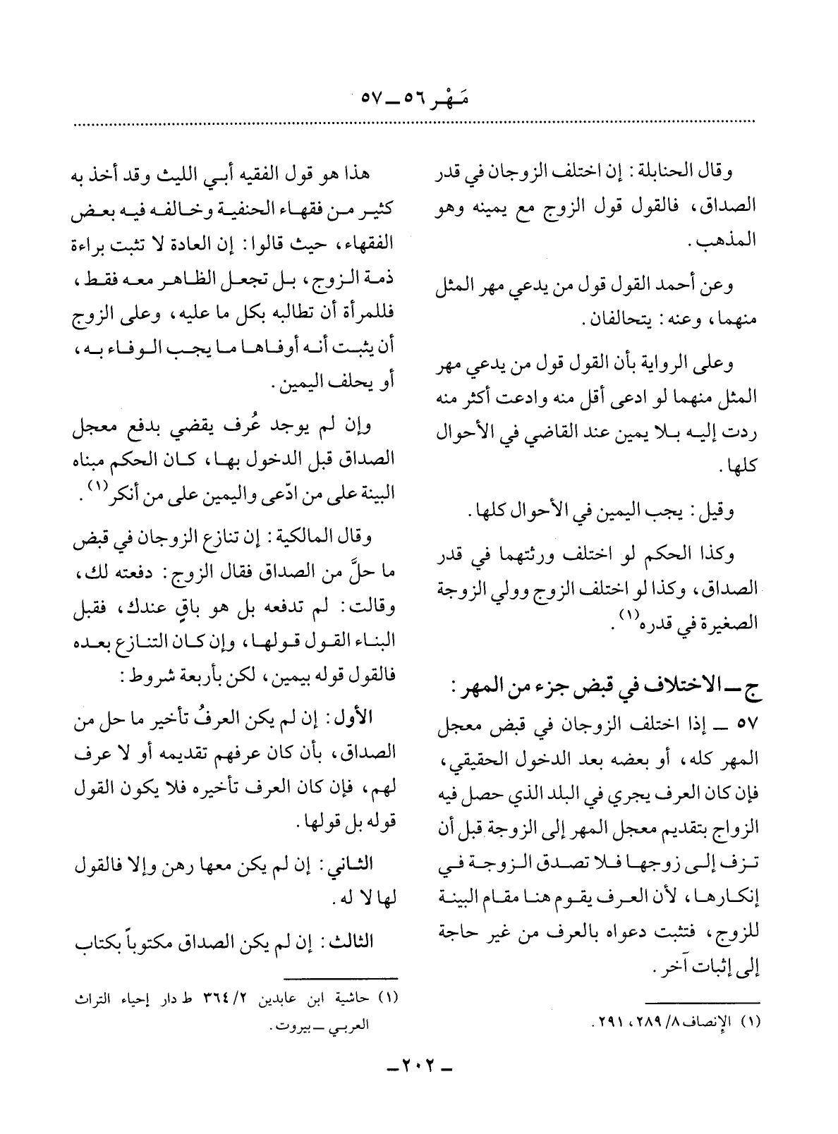 57 - إِذَا اخْتَلَفَ الزَّوْجَانِ فِي قَبْضِ مُعَجَّل الْمَهْرِ كُلِّهِ أَوْ بَعْضِهِ بَعْدَ الدُّخُول الْحَقِيقِيِّ فَإِنْ كَانَ الْعُرْفُ يَجْرِي فِي الْبَلَدِ الَّذِي حَصَل فِيهِ الزَّوَاجُ بِتَقْدِيمِ مُعَجَّل الْمَهْرِ إِلَى الزَّوْجَةِ قَبْل أَنْ تُزَفَّ إِلَى زَوْجِهَا فَلاَ تُصَدَّقُ الزَّوْجَةُ فِي إِنْكَارِهَا لأَِنَّ الْعُرْفَ يَقُومُ هُنَا مَقَامَ الْبَيِّنَةِ لِلزَّوْجِ فَتَثْبُتُ دَعْوَاهُ بِالْعُرْفِ مِنْ غَيْرِ حَاجَةٍ إِلَى إِثْبَاتٍ آخَرَ.