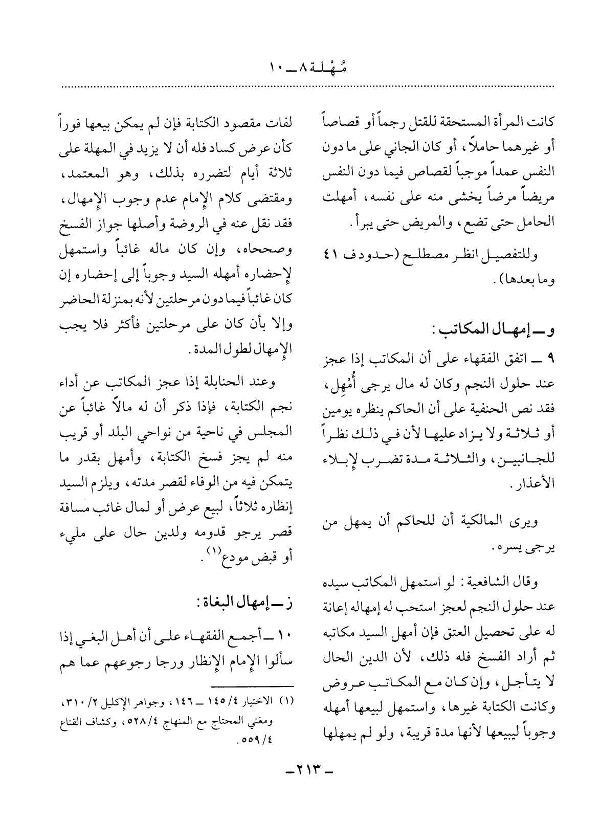 كَانَتِ الْمَرْأَةُ الْمُسْتَحِقَّةُ لِلْقَتْل رَجْمًا أَوْ قِصَاصًا أَوْ غَيْرَهُمَا حَامِلاً أَوْ كَانَ الْجَانِي عَلَى مَا دُونَ النَّفْسِ عَمْدًا مُوجِبًا لِقِصَاصٍ فِيمَا دُونَ النَّفْسِ مَرِيضًا مَرَضًا يُخْشَى مِنْهُ عَلَى نَفْسِهِ أُمْهِلَتِ الْحَامِل حَتَّى تَضَعَ وَالْمَرِيضُ حَتَّى يَبْرَأَ.
