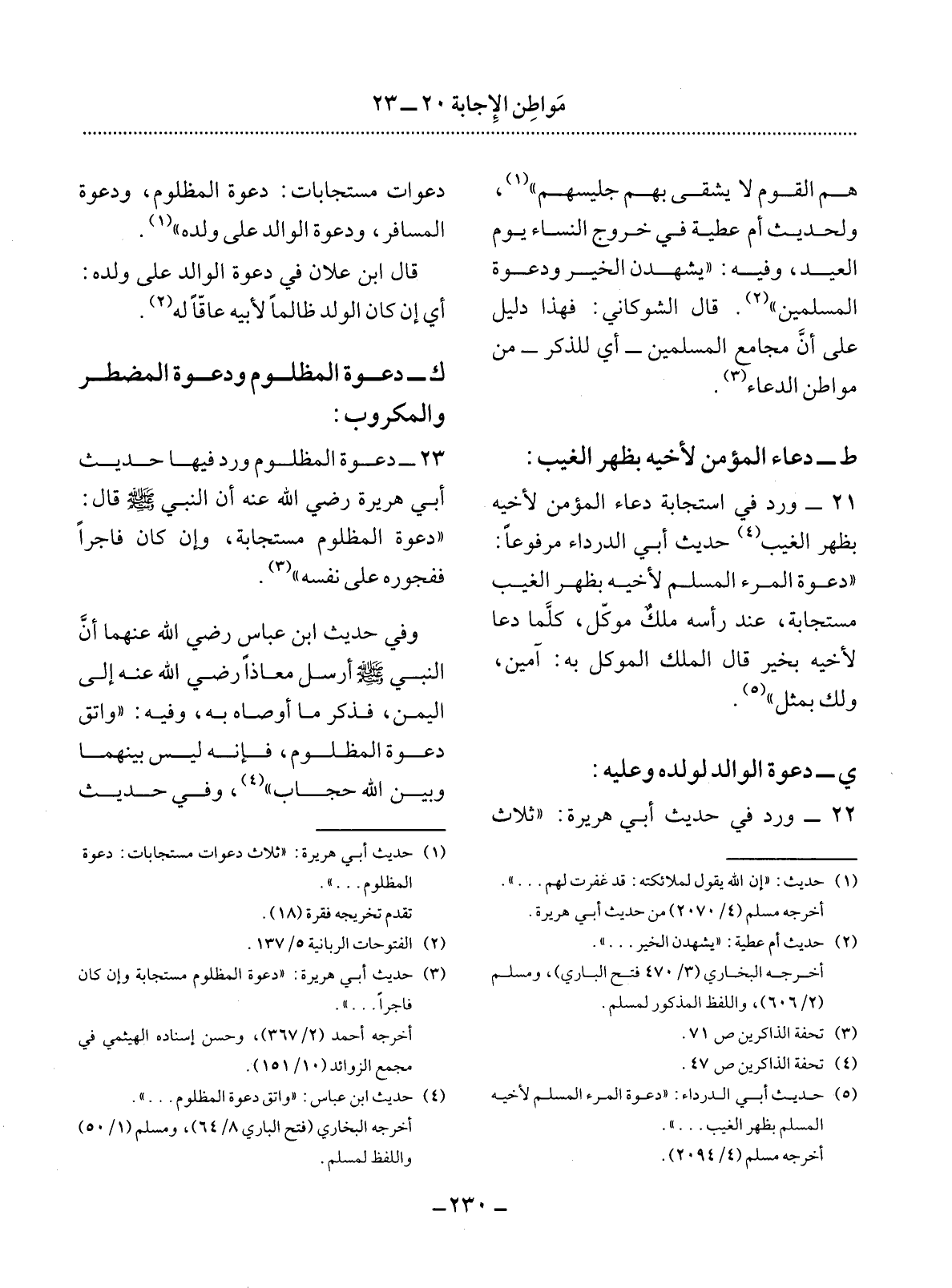 23 - دَعْوَةُ الْمَظْلُومِ وَرَدَ فِيهَا حَدِيثُ أَبِي هُرَيْرَةَ رَضِيَ اللَّهُ عَنْهُ أَنَّ النَّبِيَّ صَلَّى اللَّهُ عَلَيْهِ وَسَلَّمَ قَال: دَعْوَةُ الْمَظْلُومِ مُسْتَجَابَةٌ وَإِنْ كَانَ فَاجِرًا فَفُجُورُهُ عَلَى نَفْسِهِ (3) وَفِي حَدِيثِ ابْنِ عَبَّاسٍ رَضِيَ اللَّهُ عَنْهُمَا أَنَّ النَّبِيَّ صَلَّى اللَّهُ عَلَيْهِ وَسَلَّمَ أَرْسَل مُعَاذًا رَضِيَ اللَّهُ عَنْهُ إِلَى الْيَمَنِ فَذَكَرَ مَا أَوْصَاهُ بِهِ وَفِيهِ: وَاتَّقِ دَعْوَةَ الْمَظْلُومِ فَإِنَّهُ لَيْسَ بَيْنَهَا وَبَيْنَ اللَّهِ حِجَابٌ (4) وَفِي حَدِيثِ