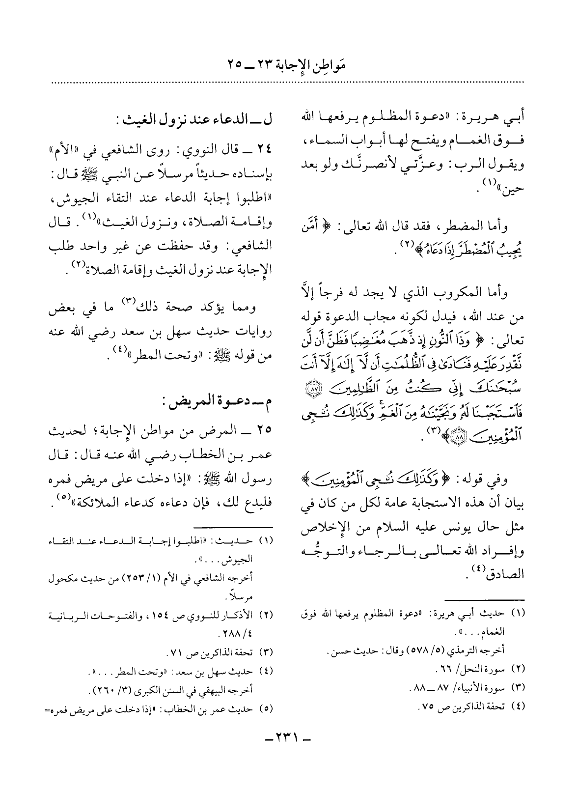 25 - الْمَرَضُ مِنْ مَوَاطِنِ الإِْجَابَةِ لِحَدِيثِ عُمَرَ بْنِ الْخَطَّابِ رَضِيَ اللَّهُ عَنْهُ قَال: قَال رَسُول اللَّهِ صَلَّى اللَّهُ عَلَيْهِ وَسَلَّمَ: إِذَا دَخَلْتَ عَلَى مَرِيضٍ فَمُرْهُ فَلْيَدْعُ لَكَ فَإِنَّ دُعَاءَهُ كَدُعَاءِ الْمَلاَئِكَةِ (5) .