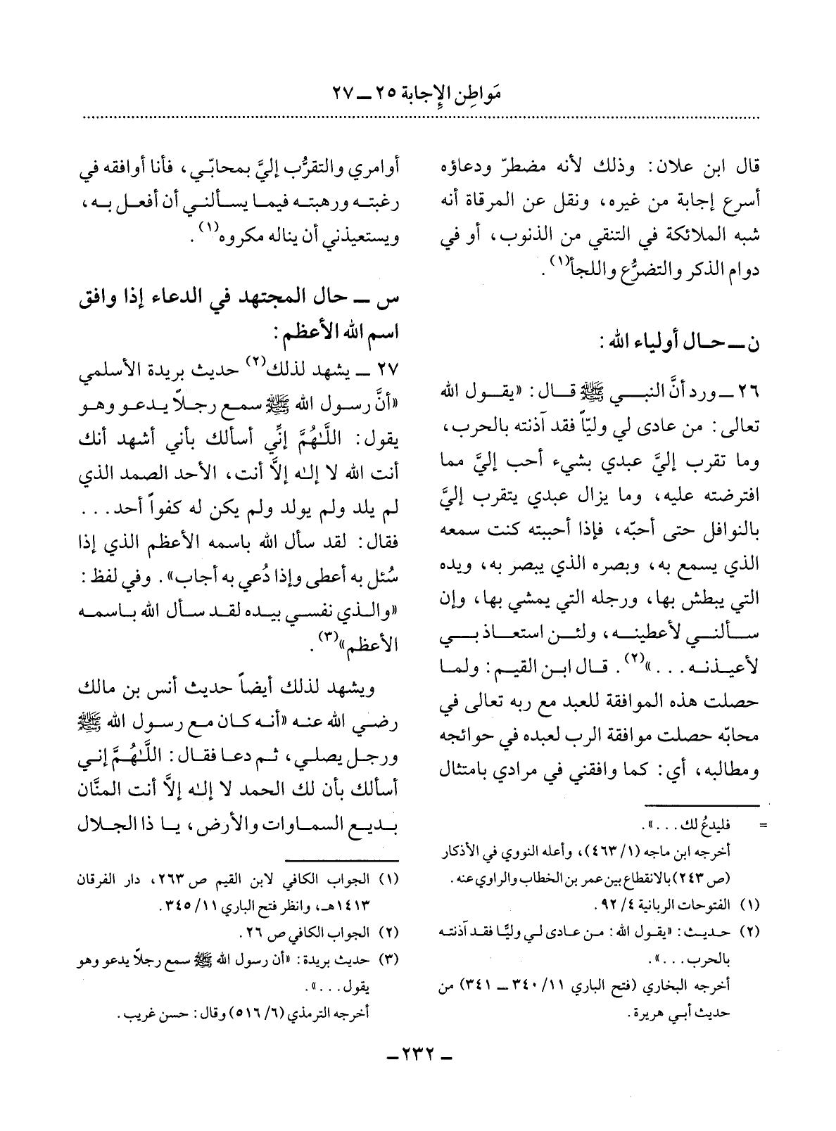26 - وَرَدَ أَنَّ النَّبِيَّ صَلَّى اللَّهُ عَلَيْهِ وَسَلَّمَ قَال: يَقُول اللَّهُ تَعَالَى: مَنْ عَادَى لِي وَلِيًّا فَقَدْ آذَنْتُهُ بِالْحَرْبِ وَمَا تَقَرَّبَ إِلَيَّ عَبْدِي بِشَيْءٍ أَحَبَّ إِلَيَّ مِمَّا افْتَرَضْتُهُ عَلَيْهِ وَمَا يَزَال عَبْدِي يَتَقَرَّبُ إِلَيَّ بِالنَّوَافِل حَتَّى أُحِبَّهُ فَإِذَا أَحْبَبْتُهُ كُنْتُ سَمْعَهُ الَّذِي يَسْمَعُ بِهِ وَبَصَرَهُ الَّذِي يُبْصِرُ بِهِ وَيَدَهُ الَّتِي يَبْطِشُ بِهَا وَرِجْلَهُ الَّتِي يَمْشِي بِهَا وَإِنْ سَأَلَنِي لأَُعْطِيَنَّهُ وَلَئِنِ اسْتَعَاذَ بِي لأَُعِيذَنَّهُ. . . (2) . قَال ابْنُ الْقَيِّمِ: وَلَمَّا حَصَلَتْ هَذِهِ الْمُوَافَقَةُ لِلْعَبْدِ مَعَ رَبِّهِ تَعَالَى فِي مَحَابِّهِ حَصَلَتْ مُوَافَقَةُ الرَّبِّ لِعَبْدِهِ فِي حَوَائِجِهِ وَمَطَالِبِهِ أَيْ: كَمَا وَافَقَنِي فِي مُرَادِي بِامْتِثَال