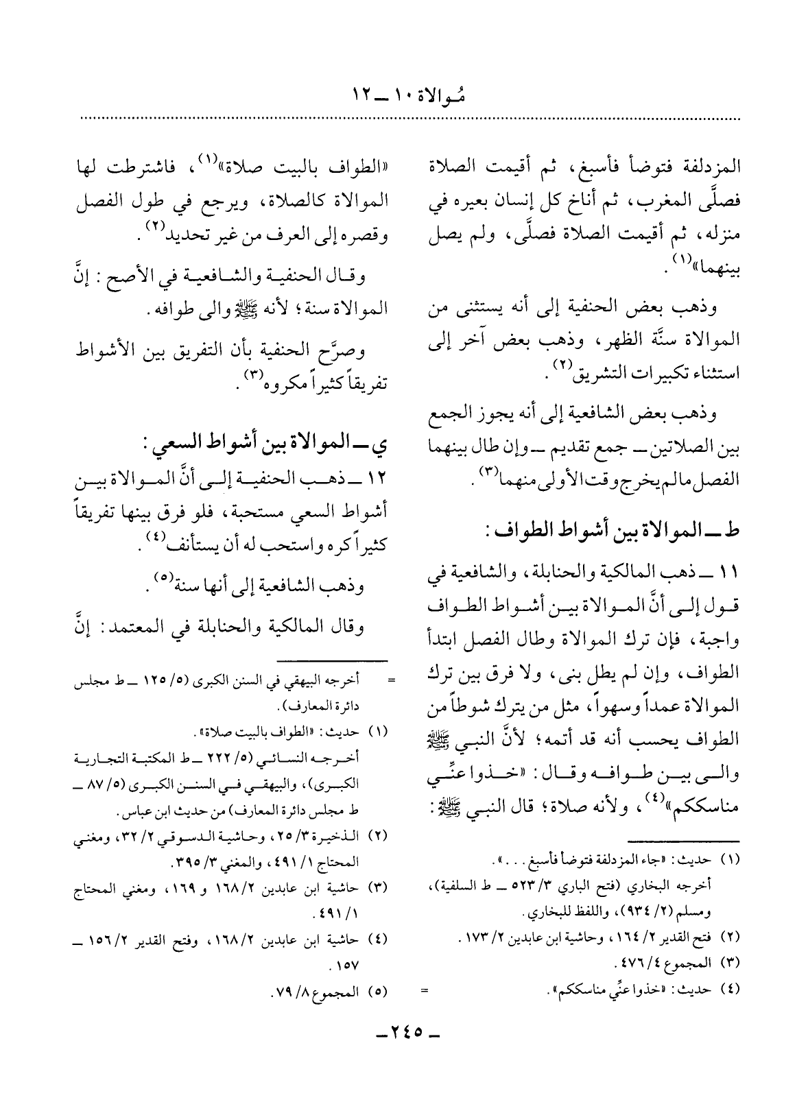 الطَّوَافُ بِالْبَيْتِ صَلاَةٌ (1) فَاشْتُرِطَتْ لَهَا الْمُوَالاَةُ كَالصَّلاَةِ وَيَرْجِعُ فِي طُول الْفَصْل وَقِصَرِهِ إِلَى الْعُرْفِ مِنْ غَيْرِ تَحْدِيدٍ (2) .