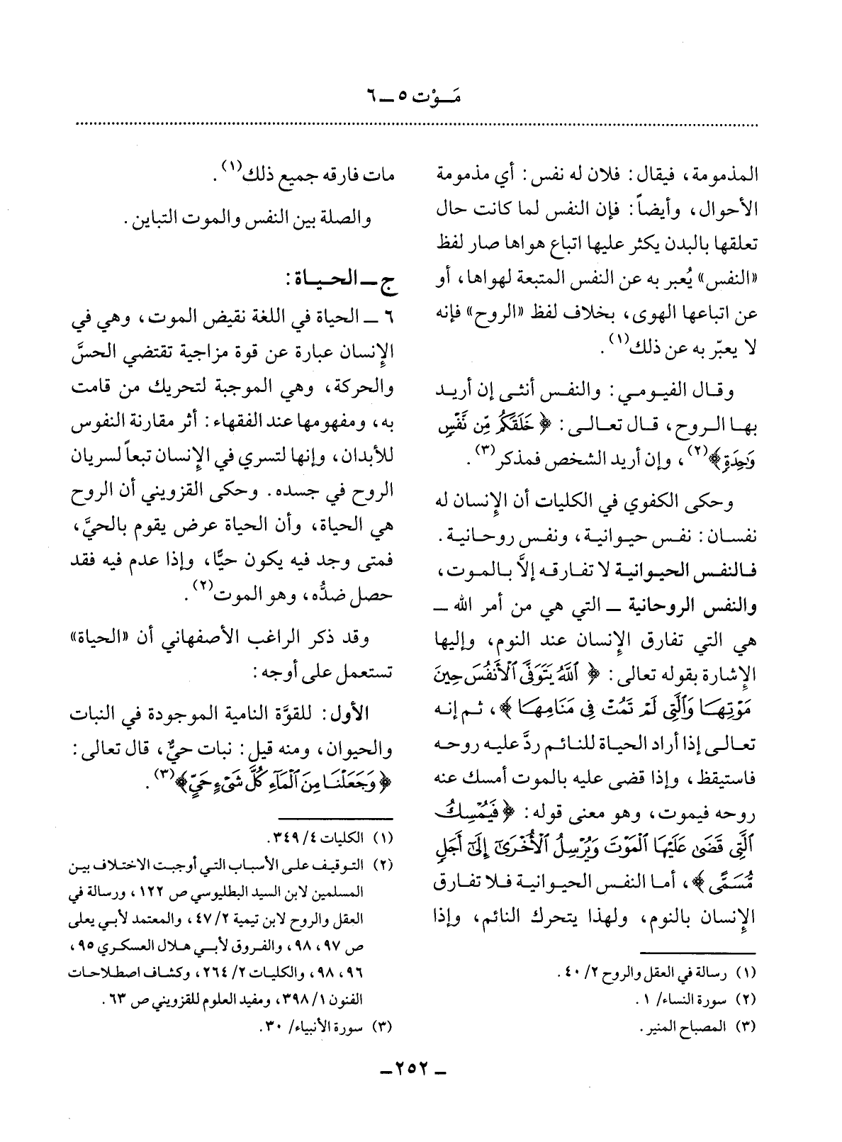 6 - الْحَيَاةُ فِي اللُّغَةِ نَقِيضُ الْمَوْتِ، وَهِيَ فِي الإِْنْسَانِ عِبَارَةٌ عَنْ قُوَّةٍ مِزَاجِيَّةٍ تَقْتَضِي الْحِسَّ وَالْحَرَكَةَ، وَهِيَ الْمُوجِبَةُ لِتَحْرِيكِ مَنْ قَامَتْ بِهِ، وَمَفْهُومُهَا عِنْدَ الْفُقَهَاءِ: أَثَرُ مُقَارَنَةِ النَّفُوسِ لِلأَْبْدَانِ، وَإِنَّهَا لَتَسْرِي فِي الإِْنْسَانِ تَبَعًا لِسَرَيَانِ الرُّوحِ فِي جَسَدِهِ. وَحَكَى الْقَزْوِينِيُّ أَنَّ الرُّوحَ هِيَ الْحَيَاةُ، وَأَنَّ الْحَيَاةَ عَرَضٌ يَقُومُ بِالْحَيِّ، فَمَتَى وُجِدَ فِيهِ يَكُونُ حَيًّا، وَإِذَا عُدِمَ فِيهِ فَقَدْ حَصَل ضِدُّهُ، وَهُوَ الْمَوْتُ (2) .