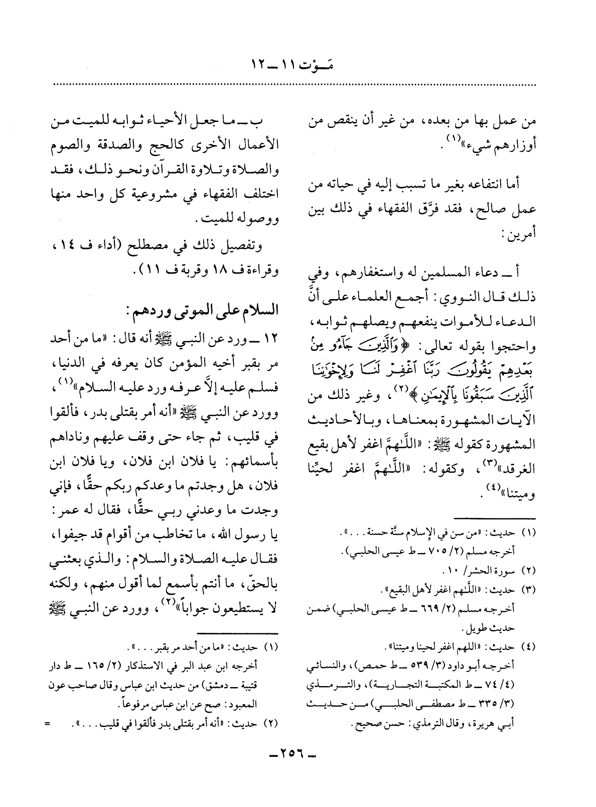 12 - وَرَدَ عَنِ النَّبِيِّ صَلَّى اللَّهُ عَلَيْهِ وَسَلَّمَ أَنَّهُ قَال: مَا مِنْ أَحَدٍ مَرَّ بِقَبْرِ أَخِيهِ الْمُؤْمِنِ كَانَ يَعْرِفُهُ فِي الدُّنْيَا، فَسَلَّمَ عَلَيْهِ إِلاَّ عَرَفَهُ وَرَدَّ عَلَيْهِ السَّلاَمَ (1) وَوَرَدَ عَنِ النَّبِيِّ صَلَّى اللَّهُ عَلَيْهِ وَسَلَّمَ أَنَّهُ أَمَرَ بِقَتْلَى بَدْرٍ، فَأُلْقُوا فِي قَلِيبٍ، ثُمَّ جَاءَ حَتَّى وَقَفَ عَلَيْهِمْ وَنَادَاهُمْ بِأَسْمَائِهِمْ: يَا فُلاَنُ ابْنُ فُلاَنٍ، وَيَا فُلاَنُ ابْنُ فُلاَنٍ، هَل وَجَدْتُمْ مَا وَعَدَكُمْ رَبُّكُمْ حَقًّا، فَإِنِّي وَجَدْتُ مَا وَعَدَنِي رَبِّي حَقًّا، فَقَال لَهُ عُمَرُ: يَا رَسُول اللَّهِ، مَا تُخَاطِبُ مِنْ أَقْوَامٍ قَدْ جَيَّفُوا، فَقَال عَلَيْهِ الصَّلَاةُ وَالسَّلَامُ: وَالَّذِي بَعَثَنِي بِالْحَقِّ، مَا أَنْتُمْ بِأَسْمَعَ لِمَا أَقُول مِنْهُمْ، وَلَكِنَّهُمْ لاَ يَسْتَطِيعُونَ جَوَابًا (2) وَوَرَدَ عَنِ النَّبِيِّ صَلَّى اللَّهُ عَلَيْهِ وَسَلَّمَ