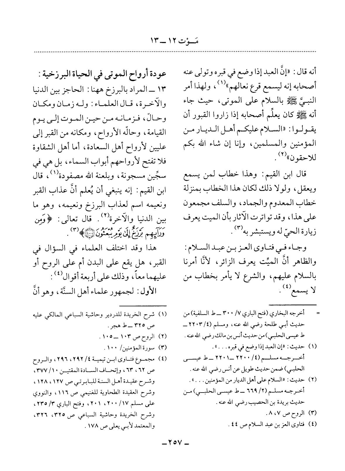 (4) مجموع فتاوى ابن تيمية 4 / 292، 296، والروح ص 62، 63، وإتحاف السادة المتقين 10 / 377، وشرح عقيدة أهل السنة للبابرتي ص 127، 128، وشرح العقيدة الطحاوية للغنيمي ص 116، والنووي على مسلم 17 / 200، 201، وفتح الباري 3 / 235، وشرح الخريدة وحاشية السباعي ص 325، 326، والمعتمد لأبي يعلى ص 178.