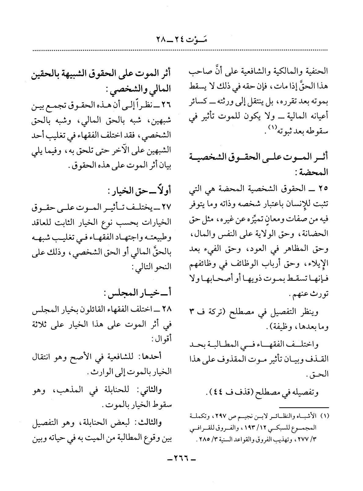 26 - نَظَرًا إِلَى أَنَّ هَذِهِ الْحُقُوقَ تَجْمَعُ بَيْنَ شَبَهَيْنِ، شَبَهٌ بِالْحَقِّ الْمَالِيِّ، وَشَبَهٌ بِالْحَقِّ الشَّخْصِيِّ، فَقَدِ اخْتَلَفَ الْفُقَهَاءُ فِي تَغْلِيبِ أَحَدِ الشَّبَهَيْنِ عَلَى الآْخَرِ حَتَّى تَلْحَقَ بِهِ، وَفِيمَا يَلِي بَيَانُ أَثَرِ الْمَوْتِ عَلَى هَذِهِ الْحُقُوقِ.