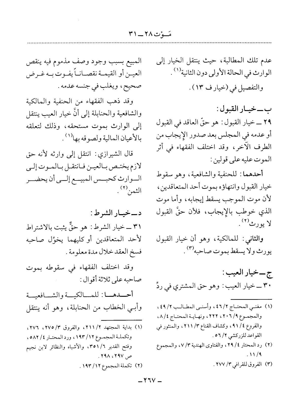 31 - خِيَارُ الشَّرْطِ: هُوَ حَقٌّ يَثْبُتُ بِالاِشْتِرَاطِ لأَِحَدِ الْمُتَعَاقِدَيْنِ أَوْ كِلَيْهِمَا يُخَوِّل صَاحِبَهُ فَسْخَ الْعَقْدِ خِلاَل مُدَّةٍ مَعْلُومَةٍ.