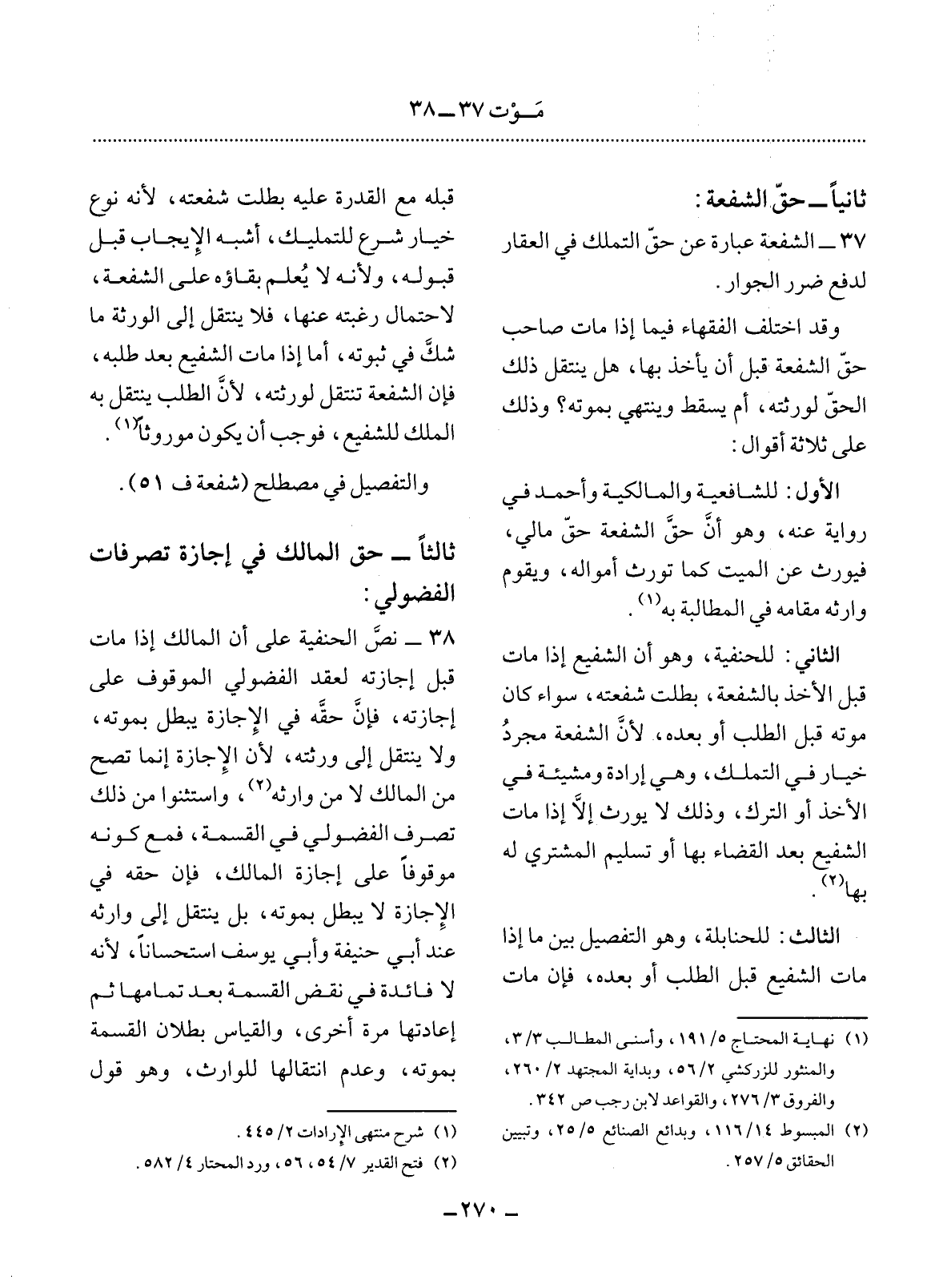 37 - الشُّفْعَةُ عِبَارَةٌ عَنْ حَقِّ التَّمَلُّكِ فِي الْعَقَارِ لِدَفْعِ ضَرَرِ الْجِوَارِ.