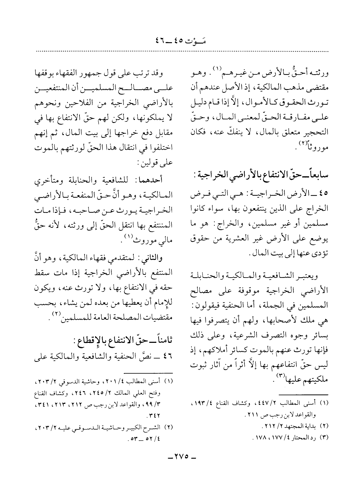 وَقَدْ تَرَتَّبَ عَلَى قَوْل جُمْهُورِ الْفُقَهَاءِ بِوَقْفِهَا عَلَى مَصَالِحِ الْمُسْلِمِينَ أَنَّ الْمُنْتَفِعِينَ بِالأَْرَاضِيِ الْخَرَاجِيَّةِ مِنَ الْفَلاَّحِينَ وَنَحْوِهِمْ لاَ يَمْلِكُونَهَا، وَلَكِنْ لَهُمْ حَقُّ الاِنْتِفَاعِ بِهَا فِي مُقَابِل دَفْعِ خَرَاجِهَا إِلَى بَيْتِ الْمَال، ثُمَّ إِنَّهُمُ اخْتَلَفُوا فِي انْتِقَال هَذَا الْحَقِّ لِوَرَثَتِهِمْ بِالْمَوْتِ عَلَى قَوْلَيْنِ: