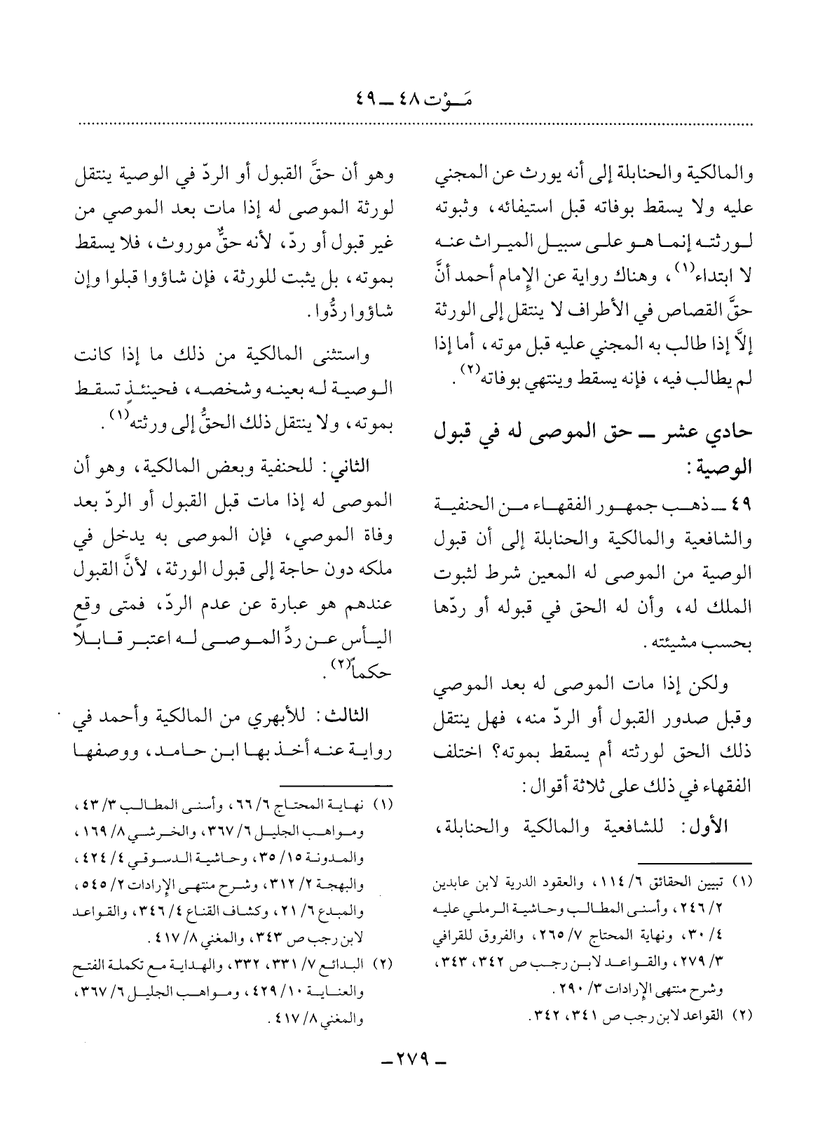 49 - ذَهَبَ جُمْهُورُ الْفُقَهَاءِ مِنَ الْحَنَفِيَّةِ وَالشَّافِعِيَّةِ وَالْمَالِكِيَّةِ وَالْحَنَابِلَةِ إِلَى أَنَّ قَبُول الْوَصِيَّةِ مِنَ الْمُوصَى لَهُ الْمُعَيَّنِ شَرْطٌ لِثُبُوتِ الْمِلْكِ لَهُ، وَأَنَّ لَهُ الْحَقَّ فِي قَبُولِهِ أَوْ رَدِّهَا بِحَسَبِ مَشِيئَتِهِ.