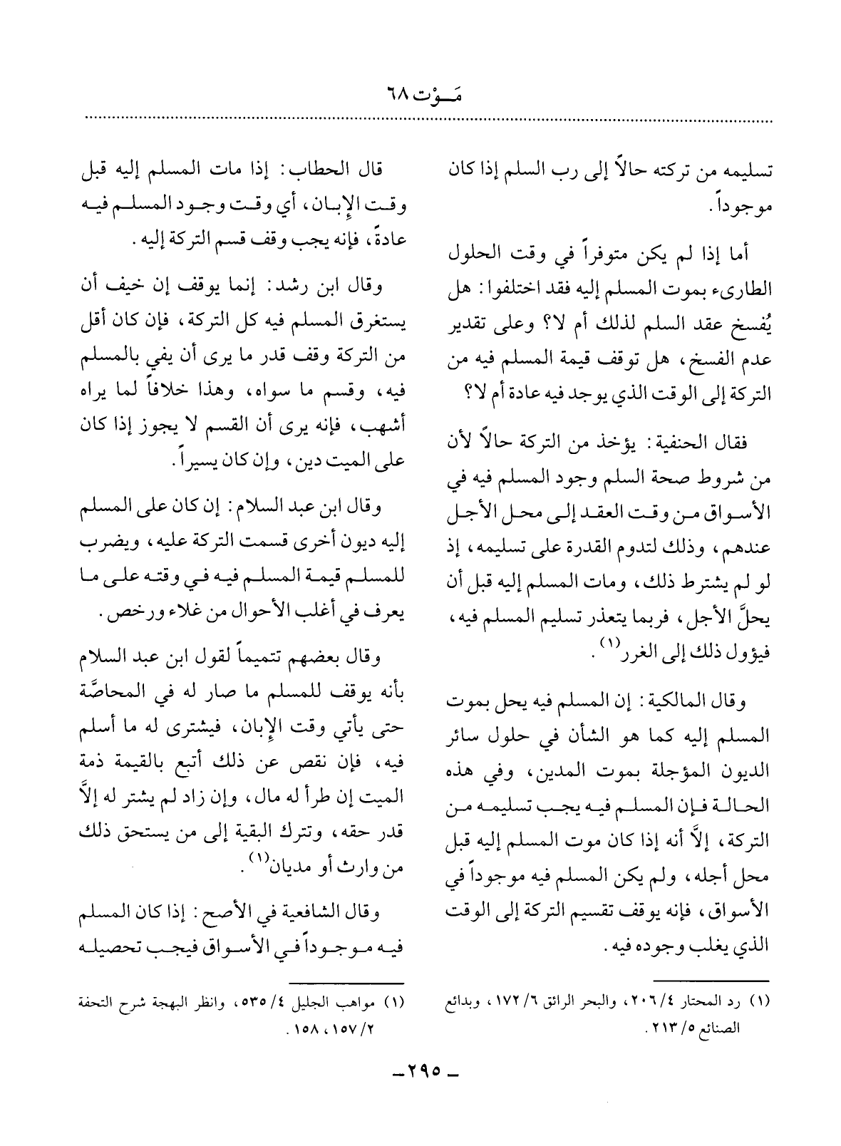 وَقَال بَعْضُهُمْ تَتْمِيمًا لِقَوْل ابْنِ عَبْدِ السَّلاَم بِأَنَّهُ يُوقَفُ لِلْمُسْلَمِ مَا صَارَ لَهُ فِي الْمُحَاصَّةِ حَتَّى يَأْتِيَ وَقْتُ الإِْبَّانِ، فَيُشْتَرَى لَهُ مَا أَسْلَمَ فِيهِ، فَإِنْ نَقَصَ عَنْ ذَلِكَ أُتْبِعَ بِالْقِيمَةِ ذِمَّةُ الْمَيِّتِ إِنْ طَرَأَ لَهُ مَالٌ، وَإِنْ زَادَ لَمْ يَشْتَرِ لَهُ إِلاَّ قَدْرَ حَقِّهِ، وَتُتْرَكُ الْبَقِيَّةُ إِلَى مَنْ يَسْتَحِقُّ ذَلِكَ مِنْ وَارِثٍ أَوْ مِدْيَانٍ (1) .