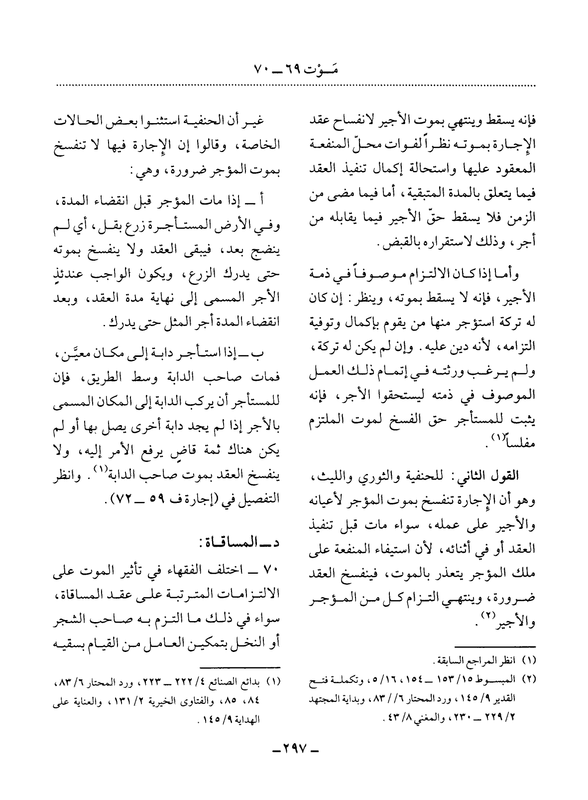 70 - اخْتَلَفَ الْفُقَهَاءُ فِي تَأْثِيرِ الْمَوْتِ عَلَى الاِلْتِزَامَاتِ الْمُتَرَتِّبَةِ عَلَى عَقْدِ الْمُسَاقَاةِ، سَوَاءٌ فِي ذَلِكَ مَا الْتَزَمَ بِهْ صَاحِبُ الشَّجَرِ أَوِ النَّخْل بِتَمْكِينِ الْعَامِل مِنَ الْقِيَامِ بِسَقْيِهِ