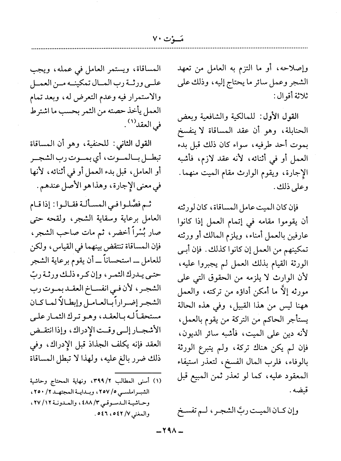 الْقَوْل الأَْوَّل: لِلْمَالِكِيَّةِ وَالشَّافِعِيَّةِ وَبَعْضِ الْحَنَابِلَةِ، وَهُوَ أَنَّ عَقْدَ الْمُسَاقَاةِ لاَ يَنْفَسِخُ بِمَوْتِ أَحَدِ طَرَفَيْهِ، سَوَاءٌ كَانَ ذَلِكَ قَبْل بَدْءِ الْعَمَل أَوْ فِي أَثْنَائِهِ، لأَِنَّهُ عَقْدٌ لاَزِمٌ، فَأَشْبَهَ الإِْجَارَةَ، وَيَقُومُ الْوَارِثُ مَقَامَ الْمَيِّتِ مِنْهُمَا.