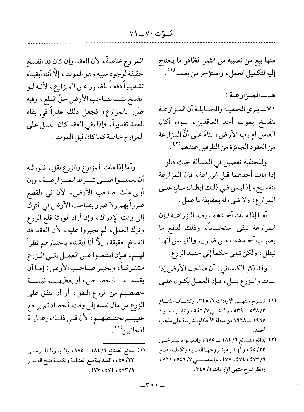 71 - يَرَى الْحَنَفِيَّةُ وَالْحَنَابِلَةُ أَنَّ الْمُزَارَعَةَ تَنْفَسِخُ بِمَوْتِ أَحَدِ الْعَاقِدَيْنِ، سَوَاءٌ أَكَانَ الْعَامِل أَمْ رَبَّ الأَْرْضِ، بِنَاءً عَلَى أَنَّ الْمُزَارَعَةَ مِنَ الْعُقُودِ الْجَائِزَةِ مِنَ الطَّرَفَيْنِ عِنْدَهُمْ (2) .