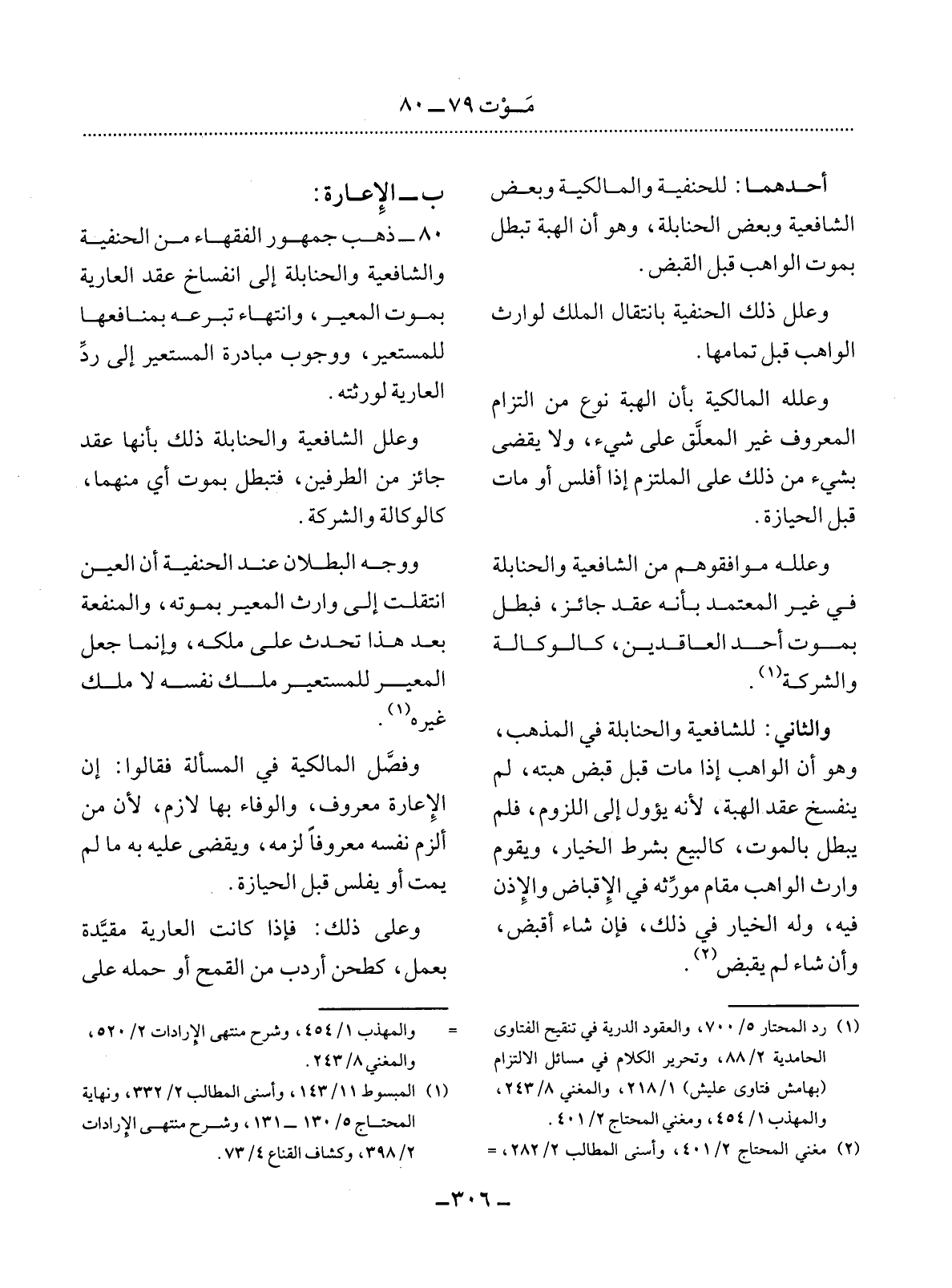 80 - ذَهَبَ جُمْهُورُ الْفُقَهَاءِ مِنَ الْحَنَفِيَّةِ وَالشَّافِعِيَّةِ وَالْحَنَابِلَةِ إِلَى انْفِسَاخِ عَقْدِ الْعَارِيَةِ بِمَوْتِ الْمُعِيرِ، وَانْتِهَاءِ تَبَرُّعِهِ بِمَنَافِعِهَا لِلْمُسْتَعِيرِ، وَوُجُوبِ مُبَادَرَةِ الْمُسْتَعِيرِ إِلَى رَدِّ الْعَارِيَةِ لِوَرَثَتِهِ.