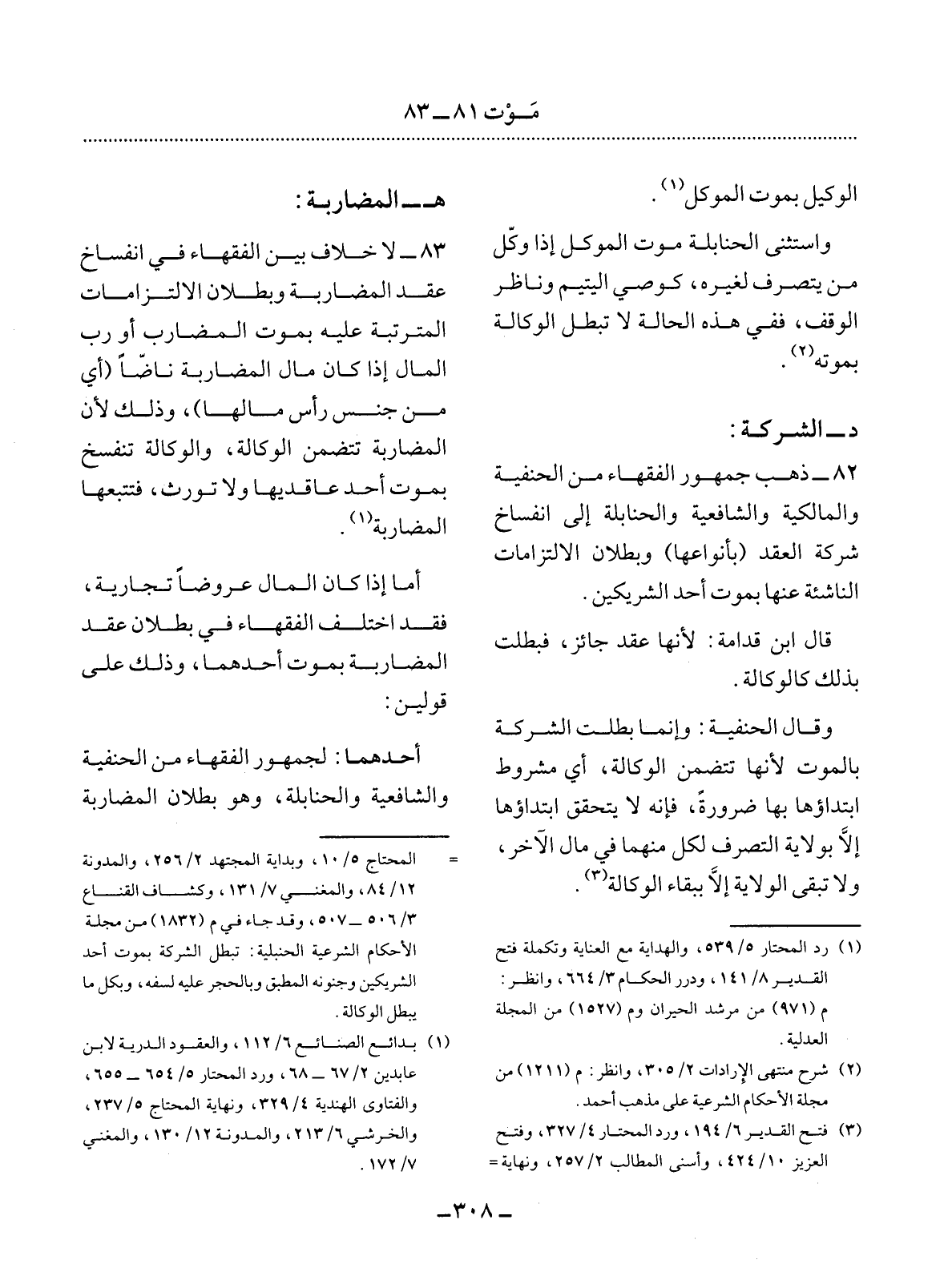 82 - ذَهَبَ جُمْهُورُ الْفُقَهَاءِ مِنَ الْحَنَفِيَّةِ وَالْمَالِكِيَّةِ وَالشَّافِعِيَّةِ وَالْحَنَابِلَةِ إِلَى انْفِسَاخِ شَرِكَةِ الْعَقْدِ (بِأَنْوَاعِهَا) وَبُطْلاَنِ الاِلْتِزَامَاتِ النَّاشِئَةِ عَنْهَا بِمَوْتِ أَحَدِ الشَّرِيكَيْنِ