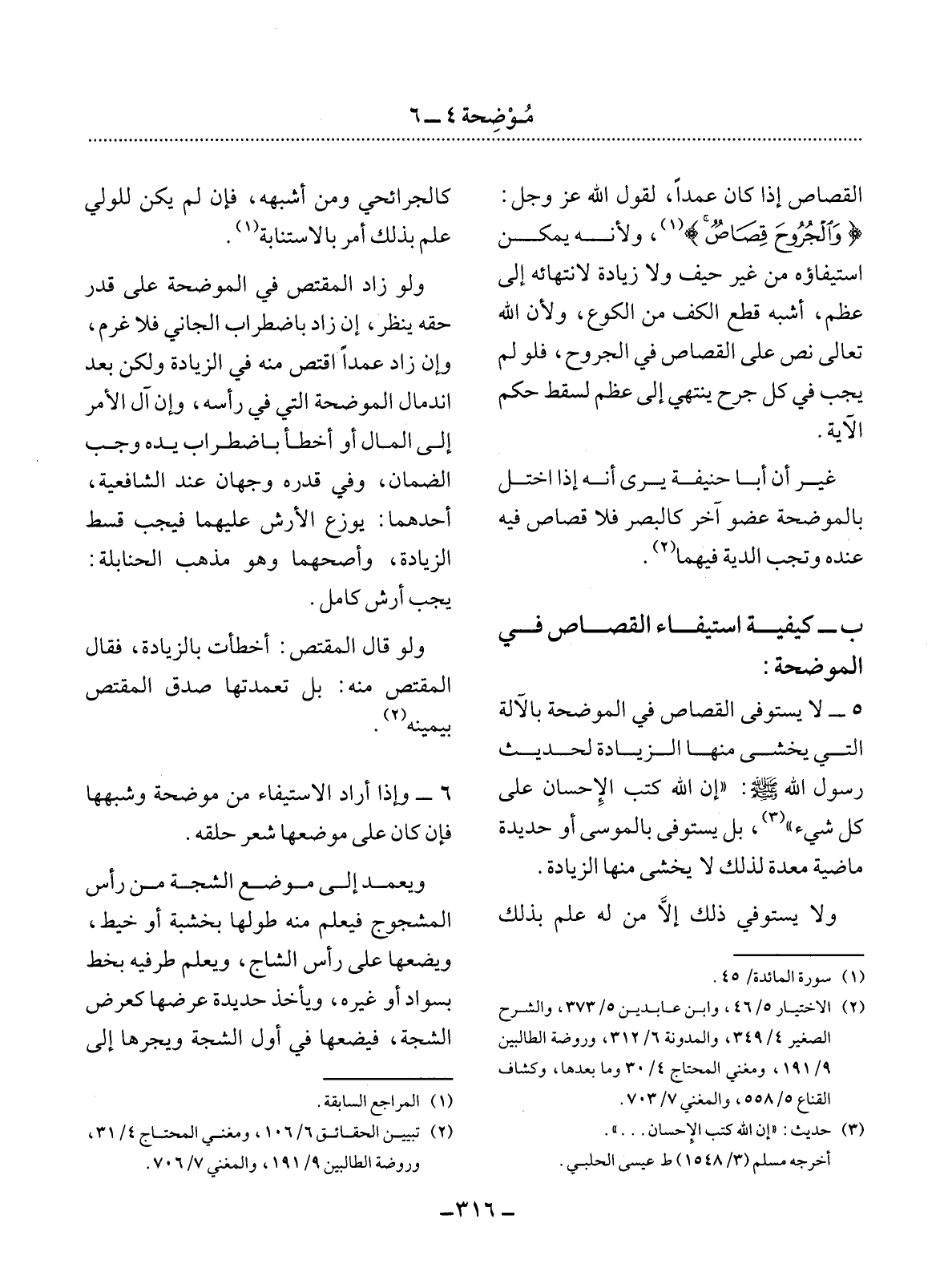5 - لاَ يُسْتَوْفَى الْقِصَاصُ فِي الْمُوضِحَةِ بِالآْلَةِ الَّتِي يُخْشَى مِنْهَا الزِّيَادَةُ لِحَدِيثِ رَسُول اللَّهِ صَلَّى اللَّهُ عَلَيْهِ وَسَلَّمَ: إِنَّ اللَّهَ كَتَبَ الإِْحْسَانَ عَلَى كُل شَيْءٍ (2) ، بَل يُسْتَوْفَى بِالْمُوسَى أَوْ حَدِيدَةٍ مَاضِيَةٍ مُعَدَّةٍ لِذَلِكَ لاَ يُخْشَى مِنْهَا الزِّيَادَةُ.