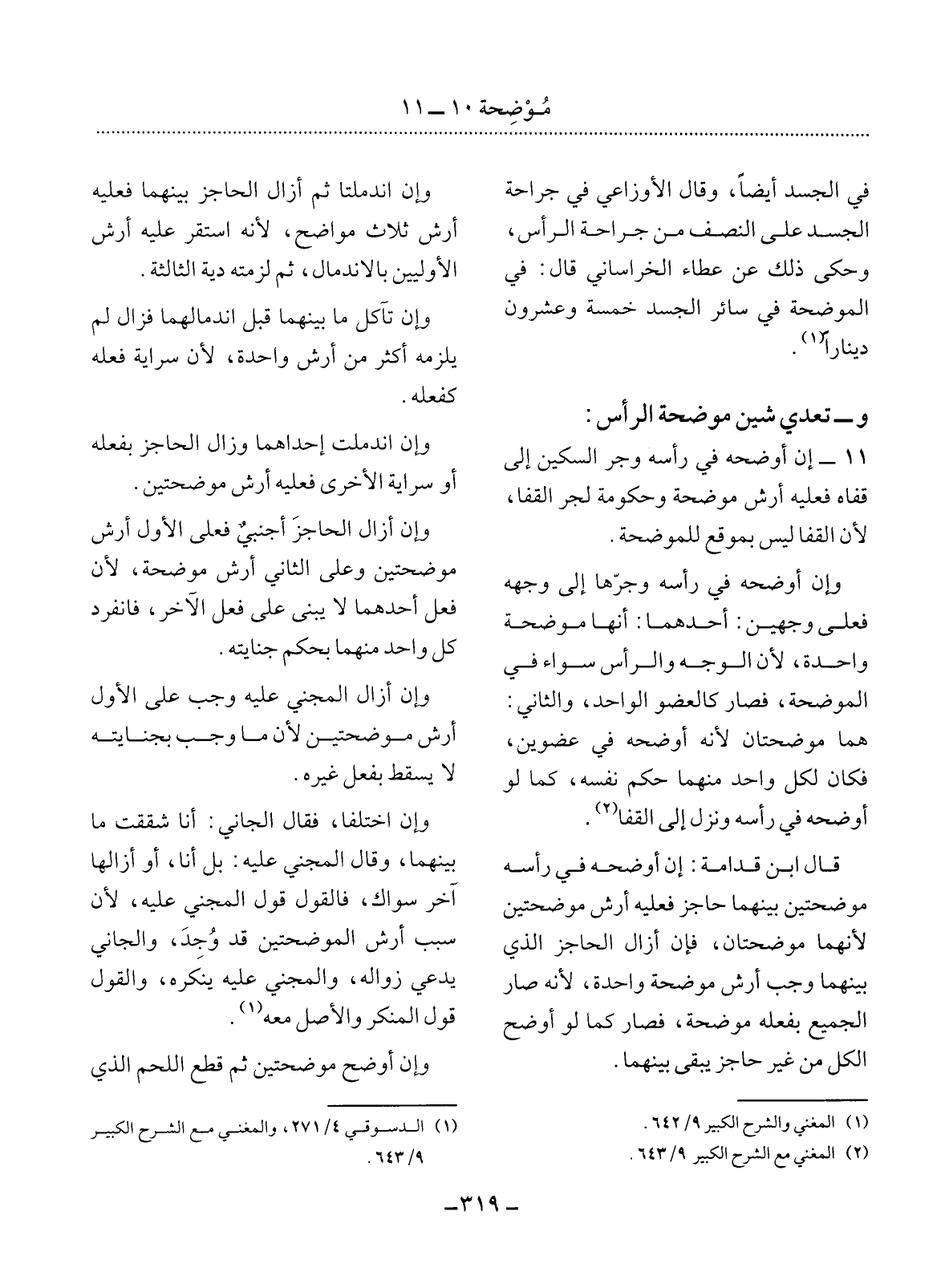 11 - إِنْ أَوْضَحَهُ فِي رَأْسِهِ وَجَرَّ السِّكِّينَ إِلَى قَفَاهُ فَعَلَيْهِ أَرْشُ مُوضِحَةٍ وَحُكُومَةٌ لِجَرِّ الْقَفَا، لأَِنَّ الْقَفَا لَيْسَ بِمَوْقِعٍ لِلْمُوضِحَةِ.