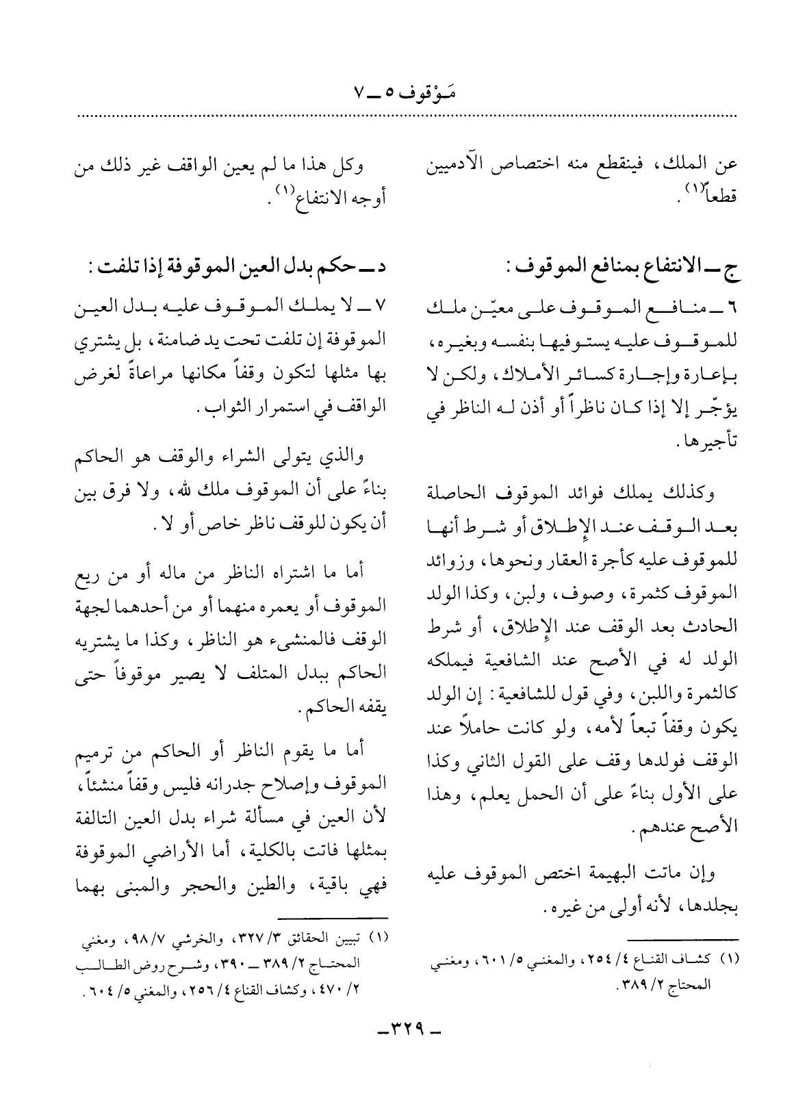 7 - لاَ يَمْلِكُ الْمَوْقُوفُ عَلَيْهِ بَدَل الْعَيْنِ الْمَوْقُوفَةَ إِنْ تَلِفَتْ تَحْتَ يَدٍ ضَامِنَةٍ، بَل يَشْتَرِي بِهَا مِثْلَهَا لِتَكُونَ وَقْفًا مَكَانَهَا مُرَاعَاةً لِغَرَضِ الْوَاقِفِ فِي اسْتِمْرَارِ الثَّوَابِ.