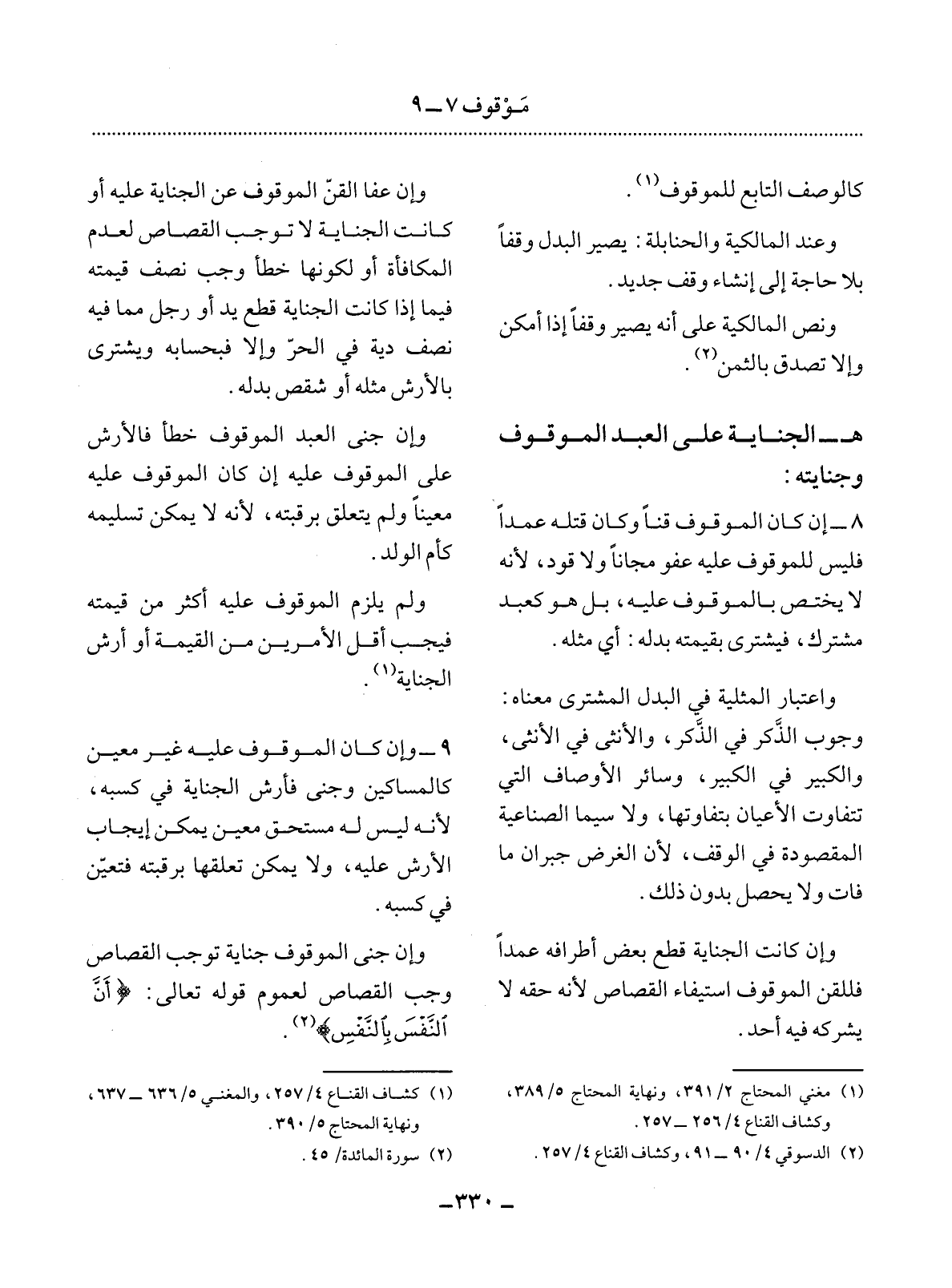 وَإِنْ جَنَى الْمَوْقُوفُ جِنَايَةً تُوجِبُ الْقِصَاصَ وَجَبَ الْقِصَاصُ لِعُمُومِ قَوْله تَعَالَى: {أَنَّ النَّفْسَ بِالنَّفْسِ} .
