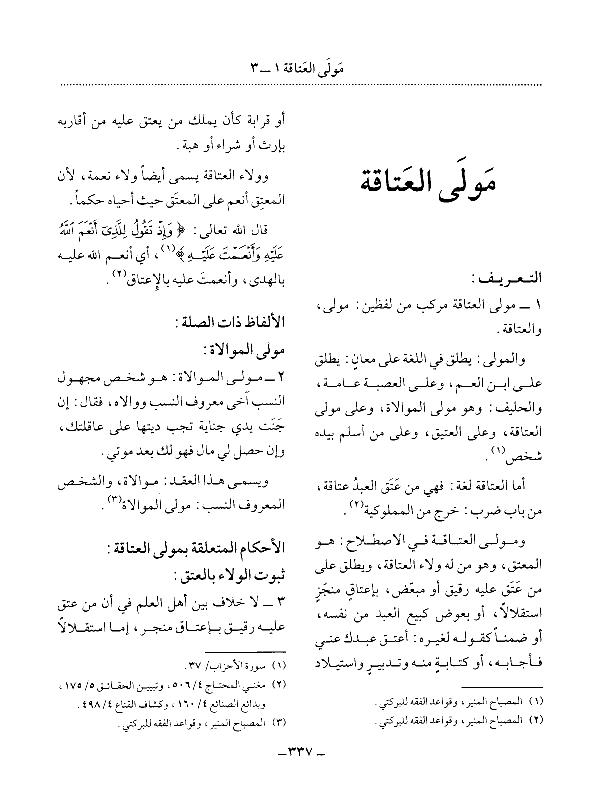 1 - مَوْلَى الْعَتَاقَةِ مُرَكَّبٌ مِنْ لَفْظَيْنِ: مَوْلًى، وَالْعَتَاقَةُ.