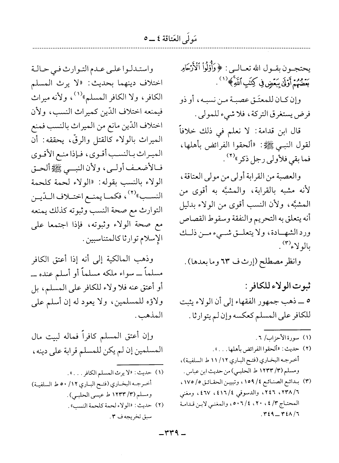 5 - ذَهَبَ جُمْهُورُ الْفُقَهَاءِ إِلَى أَنَّ الْوَلاَءَ يَثْبُتُ لِلْكَافِرِ عَلَى الْمُسْلِمِ كَعَكْسِهِ وَإِنْ لَمْ يَتَوَارَثَا.