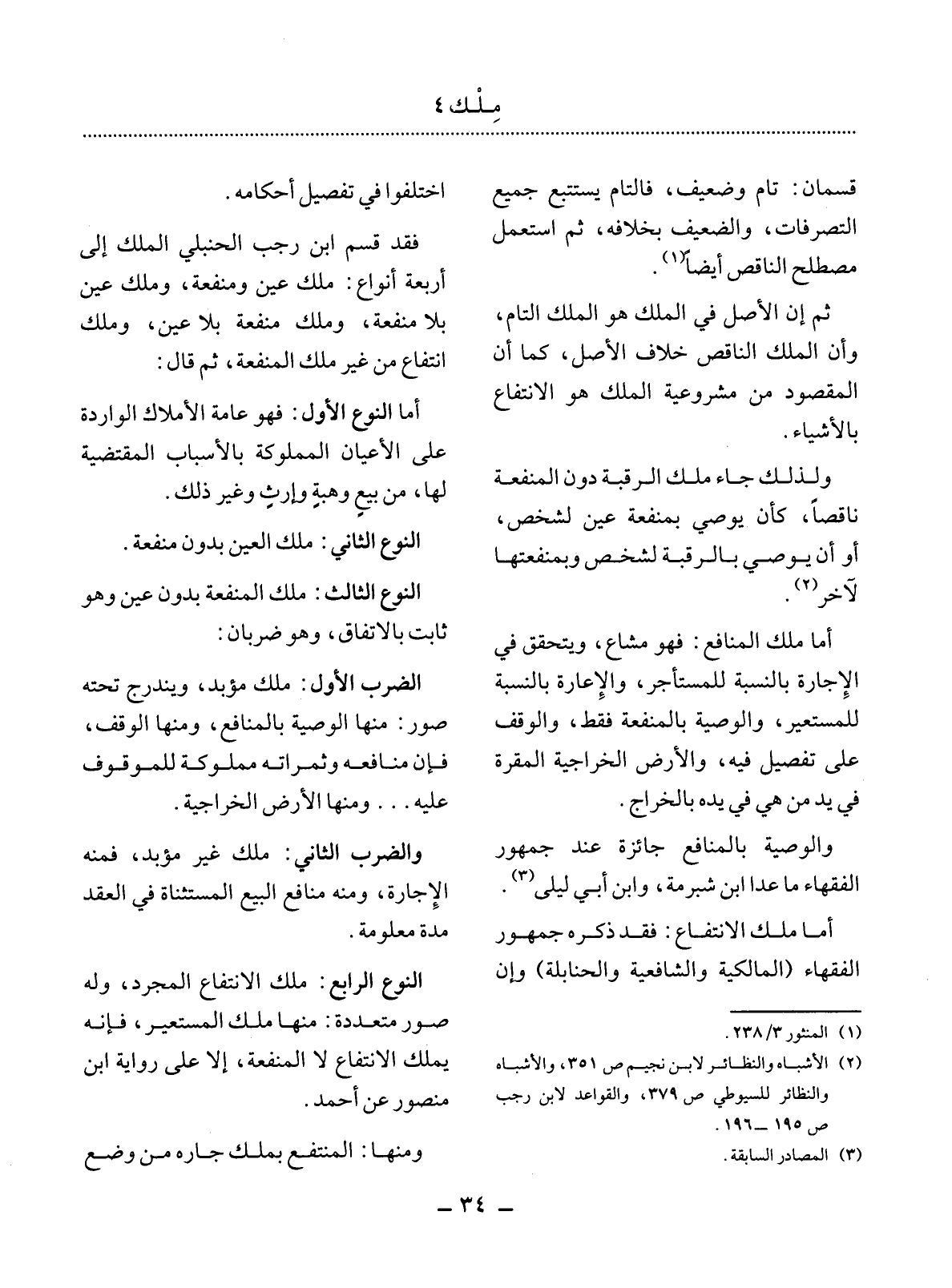 فَقَدْ قَسَّمَ ابْنُ رَجَبٍ الْحَنْبَلِيِّ الْمِلْكَ إِلَى أَرْبَعَةِ أَنْوَاعٍ: مِلْكِ عَيْنٍ وَمَنْفَعَةٍ، وَمِلْكِ عَيْنٍ بِلاَ مَنْفَعَةٍ، وَمِلْكِ مَنْفَعَةٍ بِلاَ عَيْنٍ، وَمِلْكِ انْتِفَاعٍ مِنْ غَيْرِ مِلْكِ الْمَنْفَعَةِ، ثُمَّ قَال:
