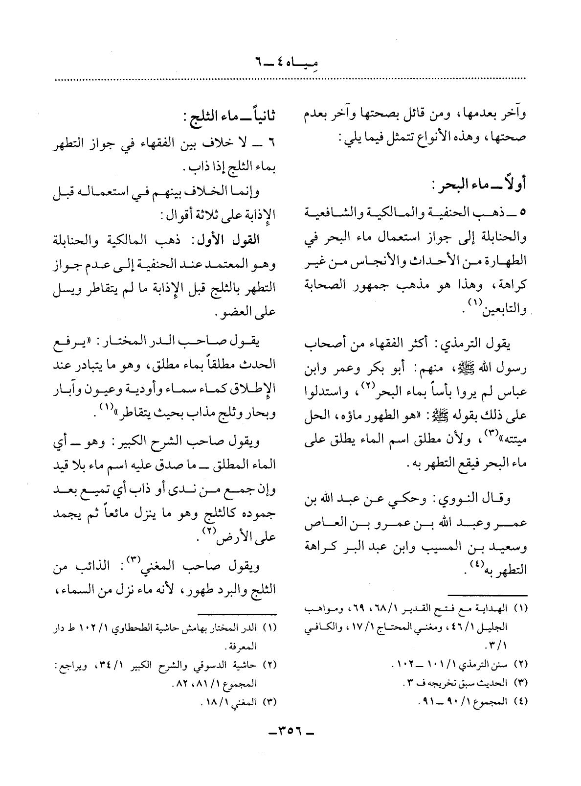 5 - ذَهَبَ الْحَنَفِيَّةُ وَالْمَالِكِيَّةُ وَالشَّافِعِيَّةُ وَالْحَنَابِلَةُ إِلَى جِوَازِ اسْتِعْمَال مَاءِ الْبَحْرِ فِي الطَّهَارَةِ مِنَ الأَْحْدَاثِ وَالأَْنْجَاسِ مِنْ غَيْرِ كَرَاهَةٍ، وَهَذَا هُوَ مَذْهَبُ جُمْهُورِ الصَّحَابَةِ وَالتَّابِعِينَ (1) .