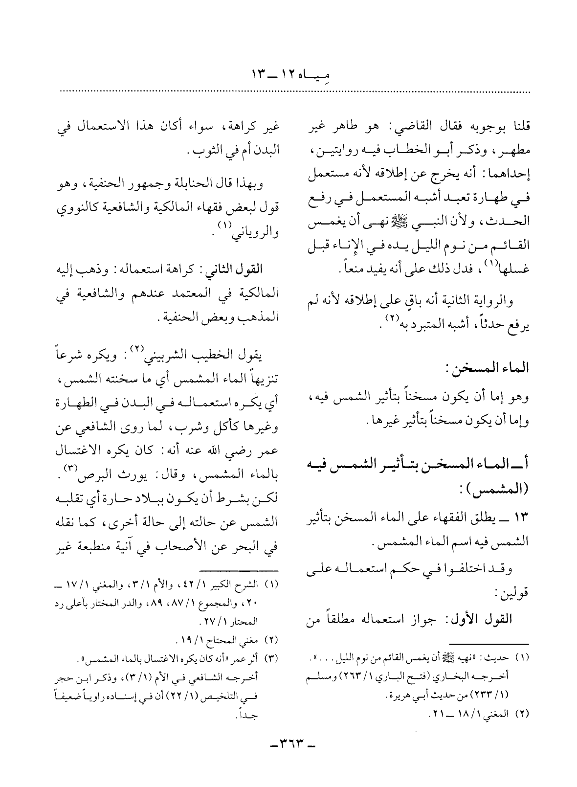 13 - يُطْلِقُ الْفُقَهَاءُ عَلَى الْمَاءِ الْمُسَخَّنِ بِتَأْثِيرِ الشَّمْسِ فِيهِ اسْمَ الْمَاءِ الْمُشَمَّسِ