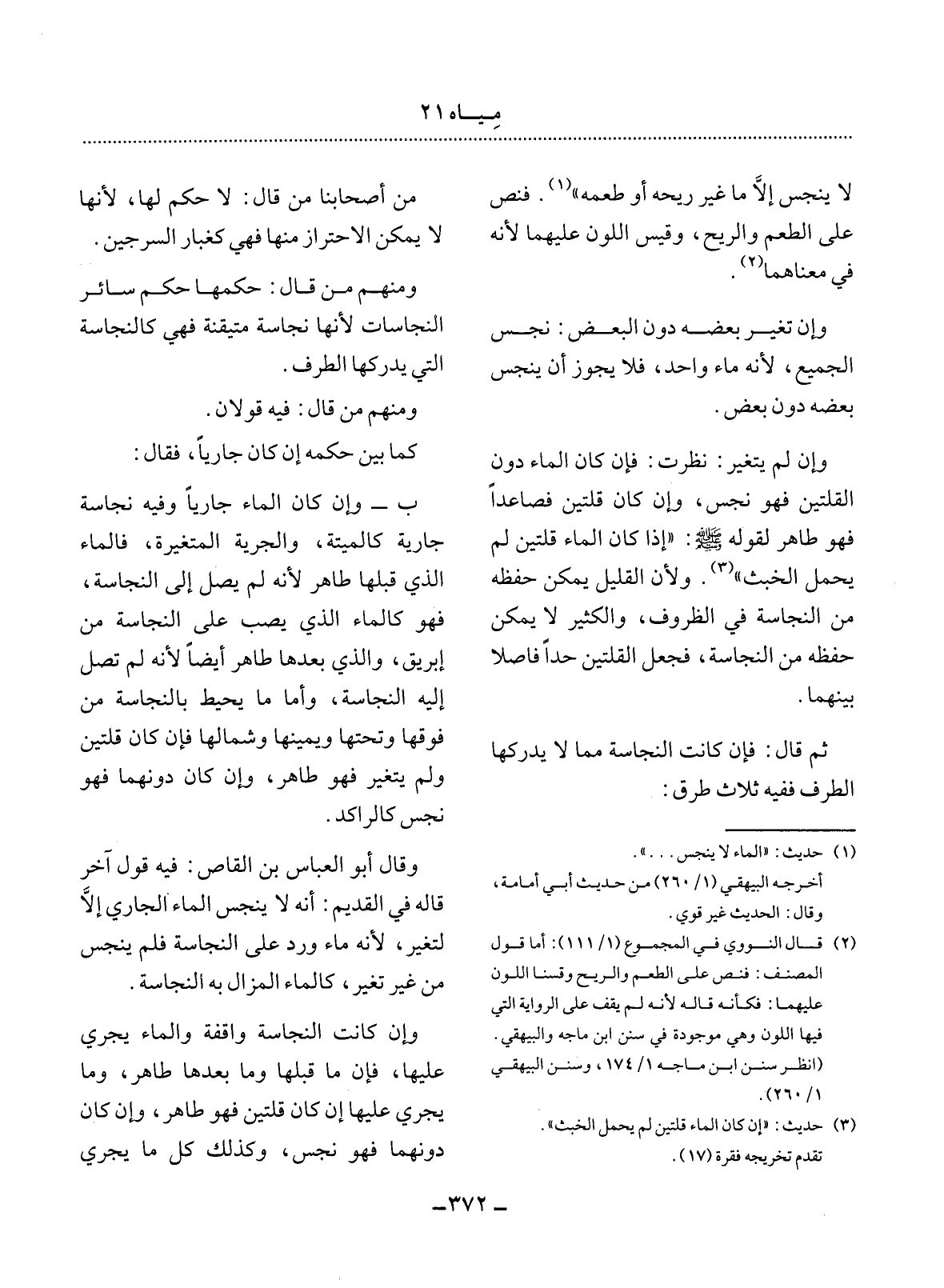 (2) قال النووي في المجموع (1 / 111) : أما قول المصنف: فنص على الطعم والريح وقسنا اللون عليهما: فكأنه قاله لأنه لم يقف على الرواية التي فيها اللون وهي موجودة في سنن ابن ماجه والبيهقي. (انظر سنن ابن ماجه 1 / 174، وسنن البيهقي 1 / 260) .