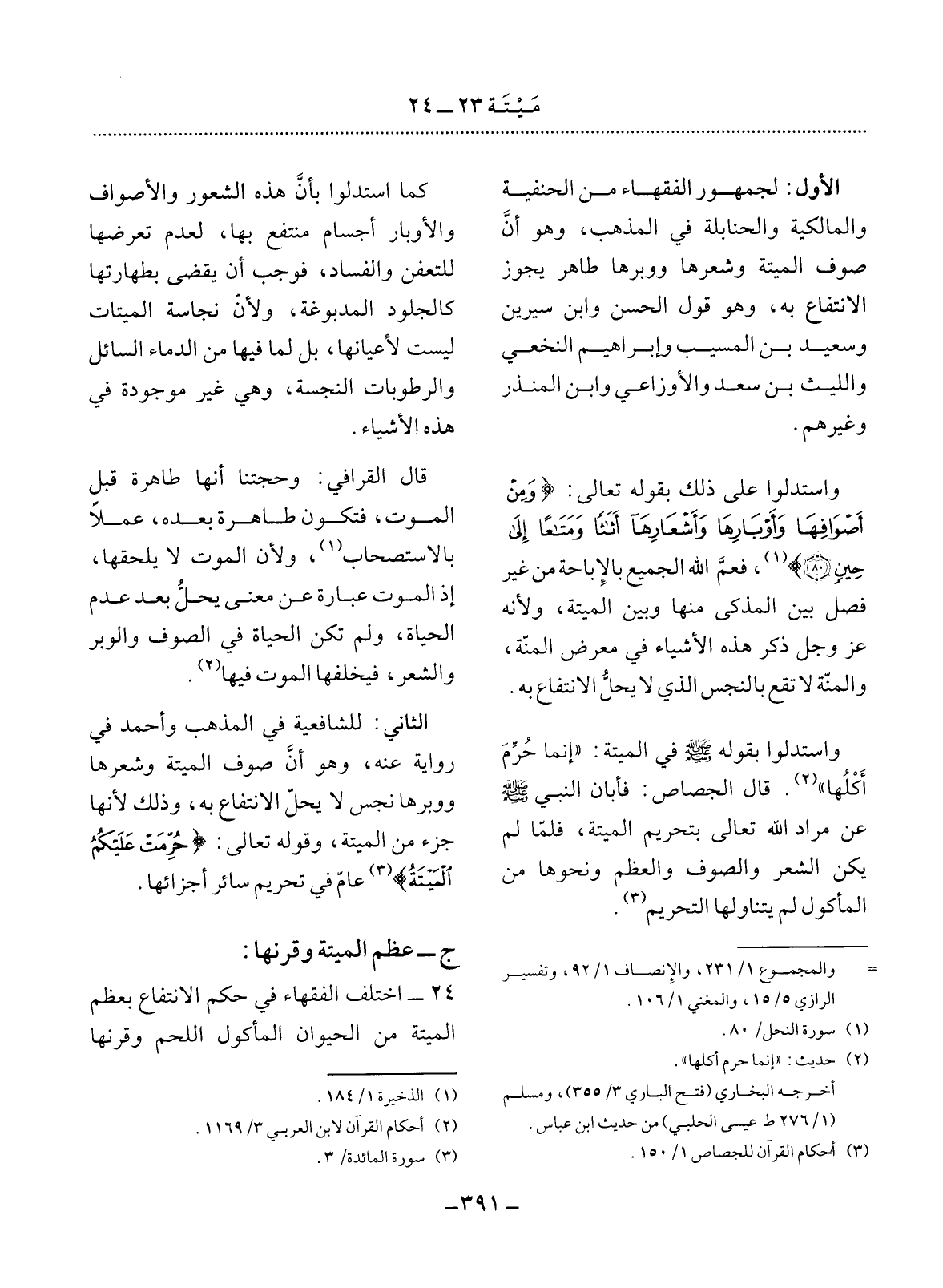 24 - اخْتَلَفَ الْفُقَهَاءُ فِي حُكْمِ الاِنْتِفَاعِ بِعَظْمِ الْمَيْتَةِ مِنَ الْحَيَوَانِ الْمَأْكُول اللَّحْمِ وَقَرْنِهَا
