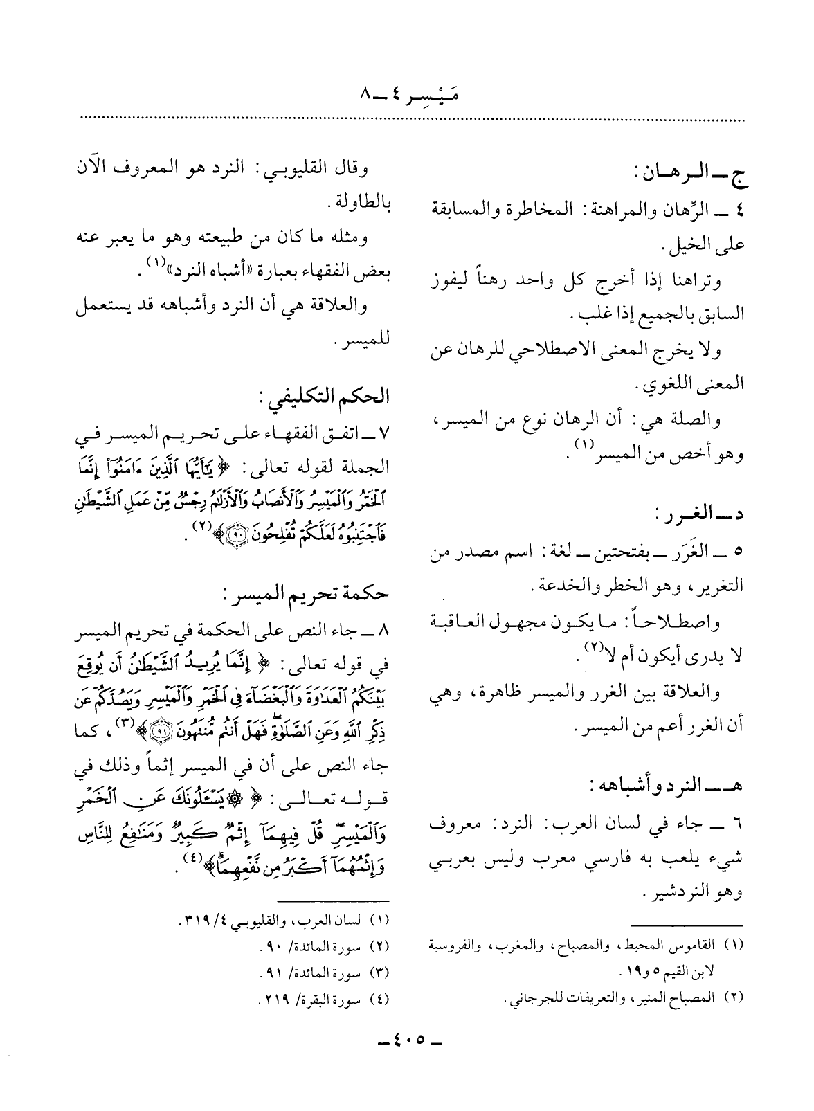 4 - الرِّهَانُ وَالْمُرَاهَنَةُ: الْمُخَاطَرَةُ وَالْمُسَابَقَةُ عَلَى الْخَيْل.