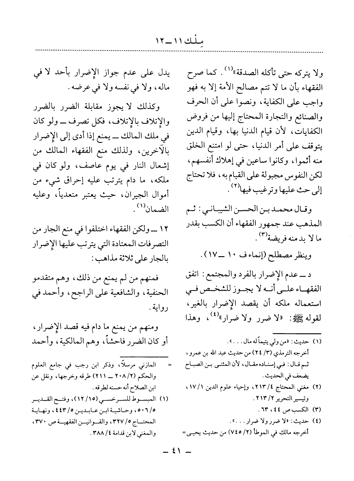 (4) حديث: " لا ضرر ولا ضرار. . . ". أخرجه مالك في الموطأ (2 / 745) من حديث يحيى المازني مرسلاً، وذكر ابن رجب في جامع العلوم والحكم (2 / 208 - 211) طرقه وخرجها، ونقل عن ابن الصلاح أنه حسنه لطرقه.