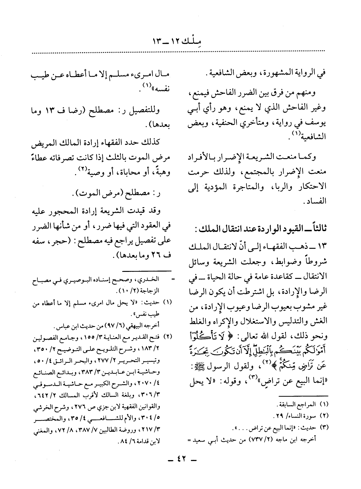 13 - ذَهَبَ الْفُقَهَاءُ إِلَى أَنَّ لاِنْتِقَال الْمِلْكِ شُرُوطًا وَضَوَابِطَ، وَجَعَلَتِ الشَّرِيعَةُ وَسَائِل الاِنْتِقَال - كَقَاعِدَةٍ عَامَّةٍ فِي حَالَةِ الْحَيَاةِ - فِي الرِّضَا وَالإِْرَادَةِ، بَل اشْتَرَطَتْ أَنْ يَكُونَ الرِّضَا غَيْرَ مَشُوبٍ بِعُيُوبِ الرِّضَا وَعُيُوبِ الإِْرَادَة، مِنَ الْغِشِّ وَالتَّدْلِيسِ وَالاِسْتِغْلاَل وَالإِْكْرَاهِ وَالْغَلَطِ وَنَحْوِ ذَلِكَ، لِقَوْل اللَّهِ تَعَالَى: {لاَ تَأْكُلُوا أَمْوَالَكُمْ بَيْنَكُمْ بِالْبَاطِل إِلاَّ أَنْ تَكُونَ تِجَارَةً عَنْ تَرَاضٍ مِنْكُمْ} (2) ، وَلِقَوْل الرَّسُول صَلَّى اللَّهُ عَلَيْهِ وَسَلَّمَ: إِنَّمَا الْبَيْعُ عَنْ تَرَاضٍ (3) ، وَقَوْلِهِ: لاَ يَحِل