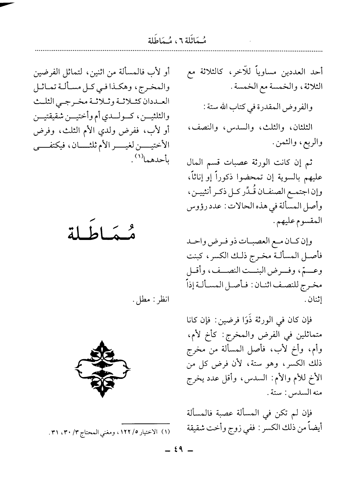 أَوْ لأَِبٍ فَالْمَسْأَلَةُ مِنِ اثْنَيْنِ، لِتَمَاثُل الْفَرْضَيْنِ وَالْمَخْرَجِ، وَهَكَذَا فِي كُل مَسْأَلَةٍ تَمَاثَل الْعَدَدَانِ كَثَلاَثَةٍ وَثَلاَثَةٍ مَخْرَجَيِ الثُّلُثِ وَالثُّلُثَيْنِ، كَوَلَدَيْ أُمٍّ وَأُخْتَيْنِ شَقِيقَتَيْنِ أَوْ لأَِبٍ، فَفَرْضُ وَلَدَيِ الأُْمِّ الثُّلُثُ، وَفَرْضُ الأُْخْتَيْنِ لِغَيْرِ الأُْمِّ ثُلُثَانِ، فَيُكْتَفَى بِأَحَدِهِمَا (1) .
