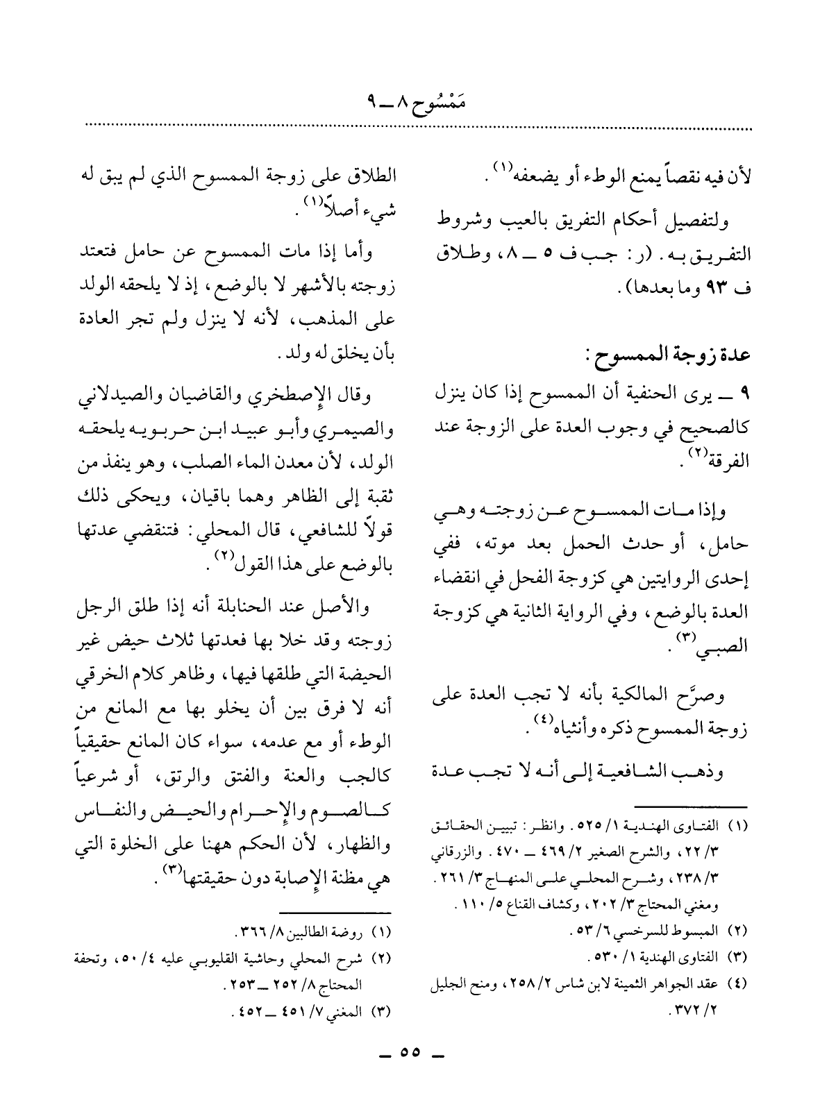 9 - يَرَى الْحَنَفِيَّةُ أَنَّ الْمَمْسُوحَ إِذَا كَانَ يُنْزِل كَالصَّحِيحِ فِي وُجُوبِ الْعِدَّةِ عَلَى الزَّوْجَةِ عِنْدَ الْفُرْقَةِ (2) .