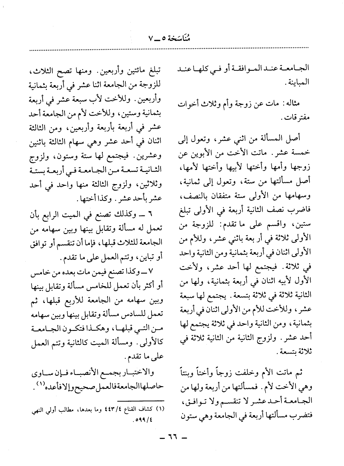 7 - وَكَذَا تَصْنَعُ فِيمَنْ مَاتَ بَعْدَهُ مِنْ خَامِسٍ أَوْ أَكْثَرَ بِأَنْ تَعْمَل لِلْخَامِسِ مَسْأَلَةً وَتُقَابِل بَيْنَهَا وَبَيْنَ سِهَامِهِ مِنَ الْجَامِعَةِ لِلأَْرْبَعِ قَبْلَهَا، ثُمَّ تَعْمَل لِلسَّادِسِ مَسْأَلَةً وَتُقَابِل بَيْنَهَا وَبَيْنَ سِهَامِهِ مِنَ الَّتِي قَبْلَهَا، وَهَكَذَا فَتَكُونُ الْجَامِعَةُ كَالأُْولَى. وَمَسْأَلَةُ الْمَيِّتِ كَالثَّانِيَةِ وَتُتِمُّ الْعَمَل عَلَى مَا تَقَدَّمَ.
