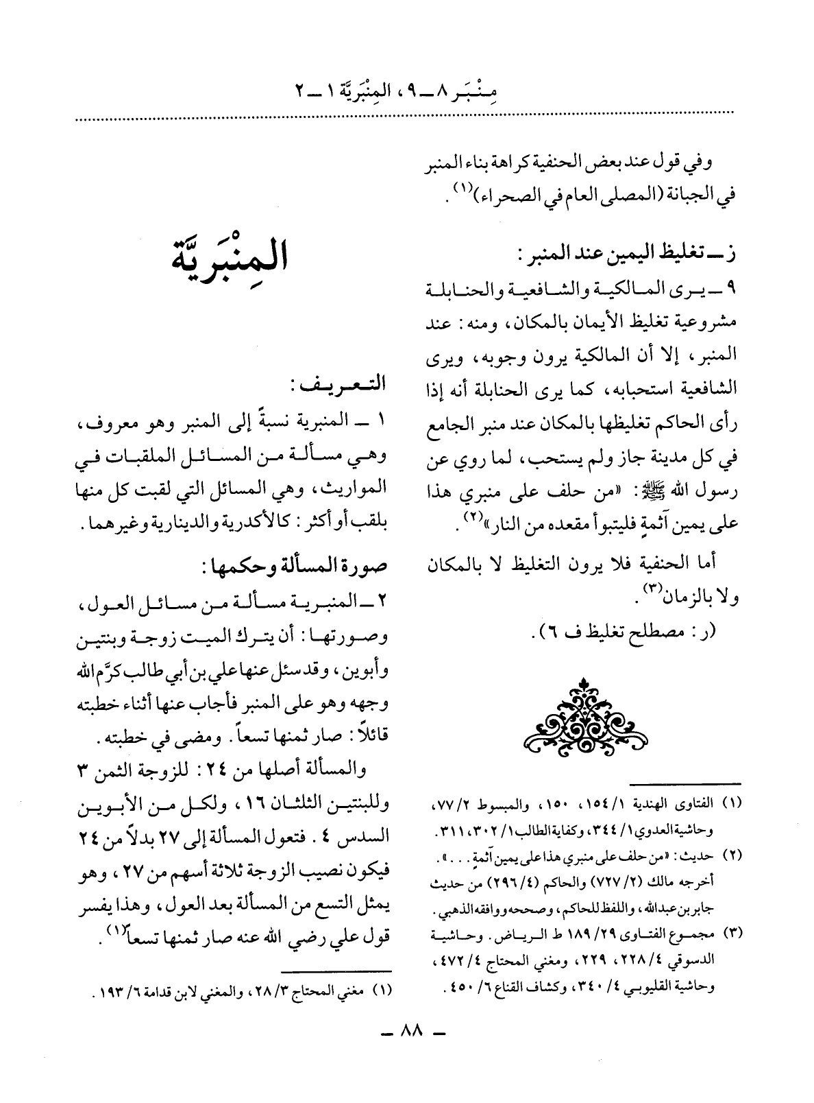 1 - الْمِنْبَرِيَّةُ نِسْبَةٌ إِلَى الْمِنْبَرِ وَهُوَ مَعْرُوفٌ؛ وَهِيَ مَسْأَلَةٌ مِنَ الْمَسَائِل الْمُلَقَّبَاتِ فِي الْمَوَارِيثِ؛ وَهِيَ الْمَسَائِل الَّتِي لُقِّبَتْ كُلٌّ مِنْهَا بِلَقَبٍ أَوْ أَكْثَرَ: كَالأَْكْدَرِيَّةِ وَالدِّينَارِيَّةِ وَغَيْرِهِمَا.